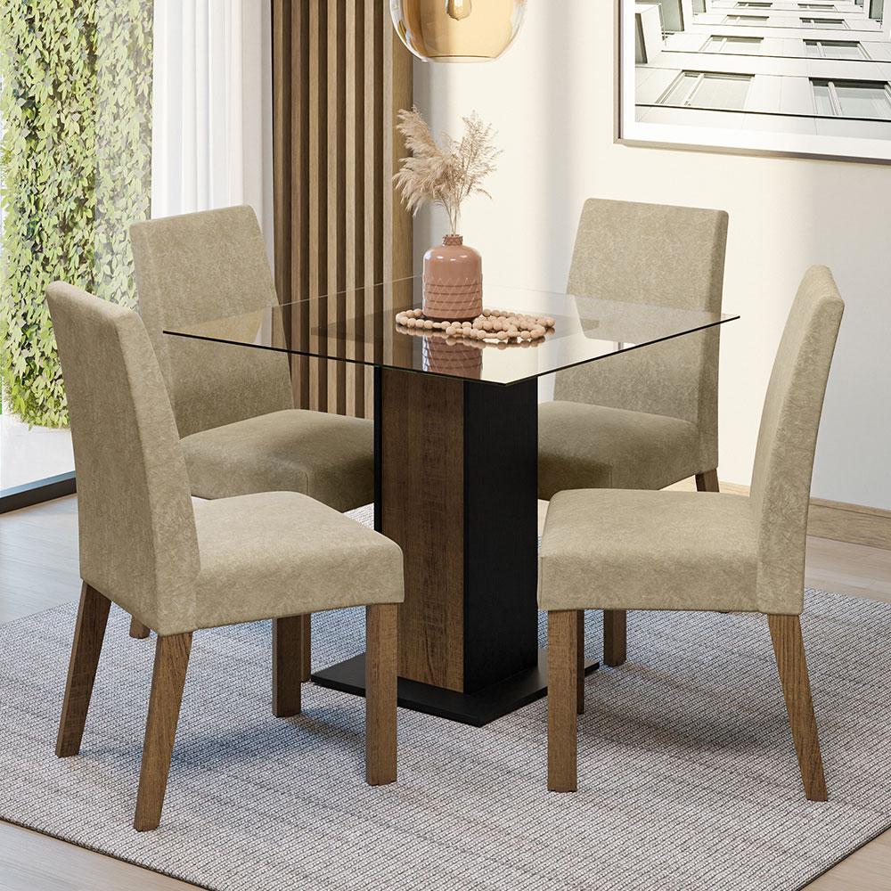 Conjunto Sala de Jantar Mesa Tampo de Vidro 4 Cadeiras Rustic/Crema/Imperial Anaju Madesa