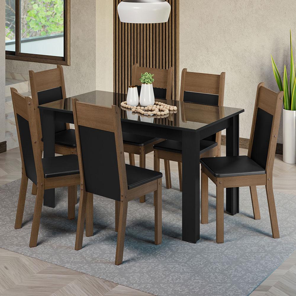 Conjunto Sala de Jantar Mesa Tampo de Vidro 6 Cadeiras Preto/Rustic Dora Madesa