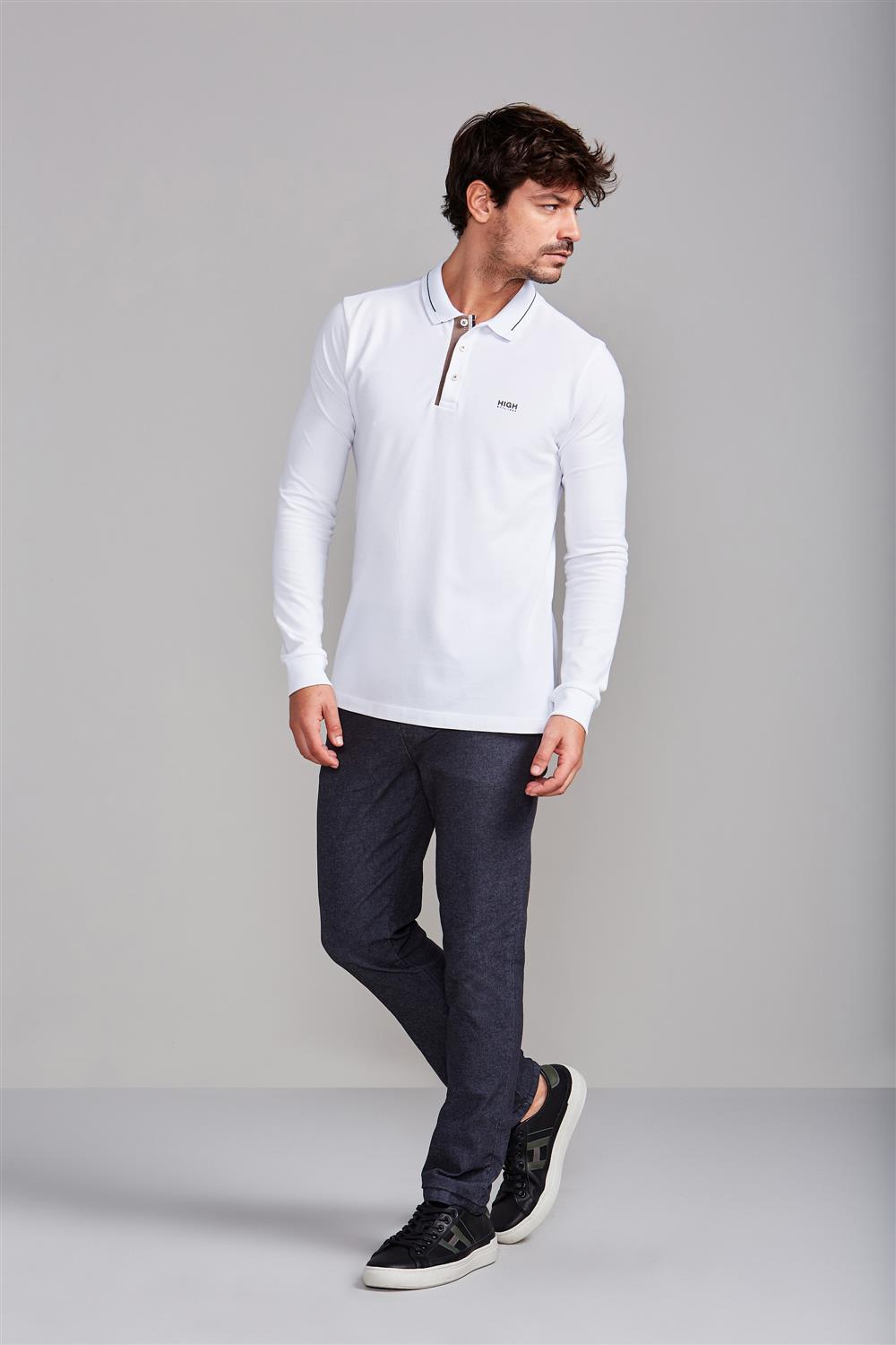 Camisa Polo Manga Longa Piquet Slim Fit - Branco