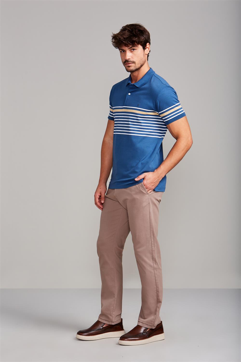 Camisa Polo com Bolso Piquet Comfort - Marrom Amêndoa / Azul Marinho