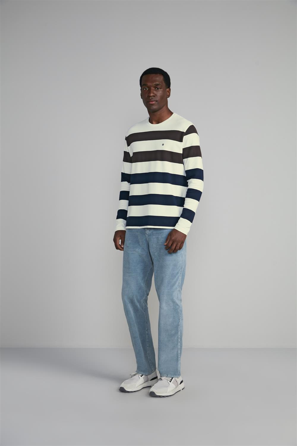 Camiseta Manga Longa Piquet Comfort - Bege Creme / Azul Marinho