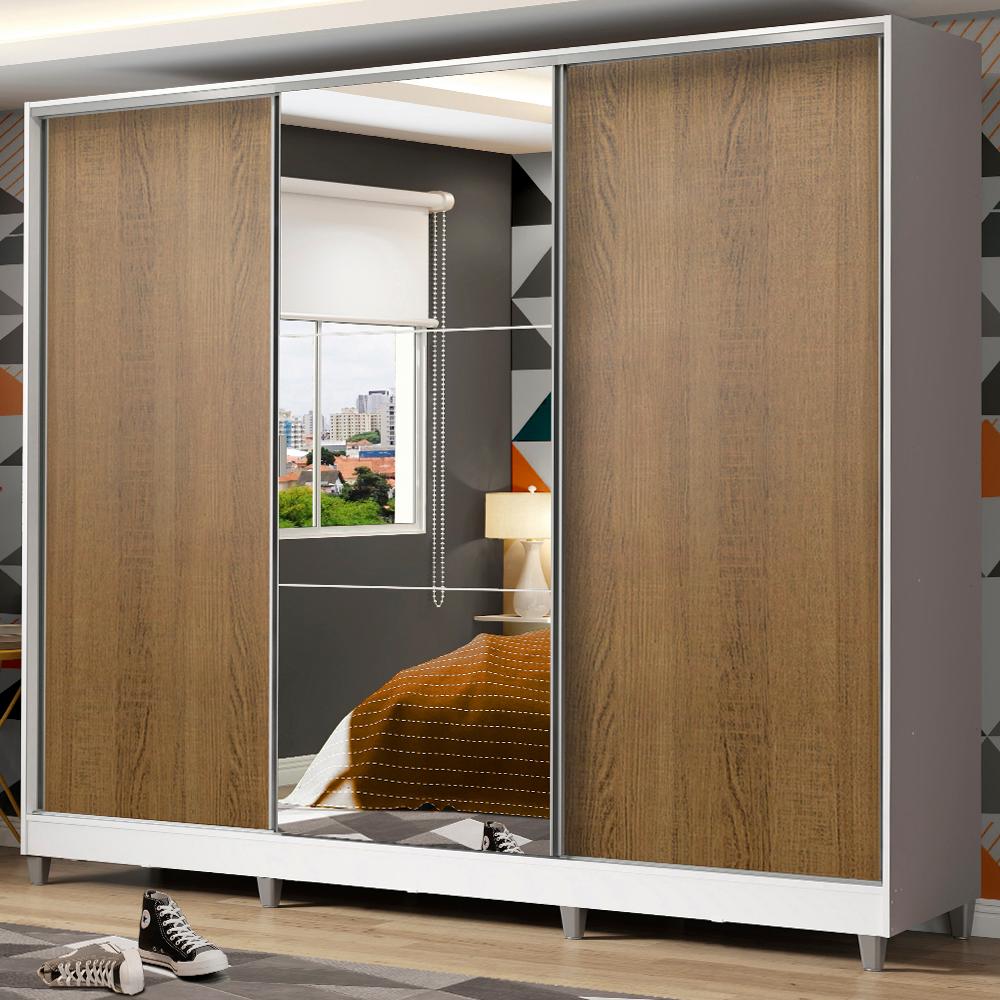 Guarda Roupa Juvenil 100% MDF Madesa Kevin 3 Portas de Correr com Espelho com Pés - Branco/Rustic