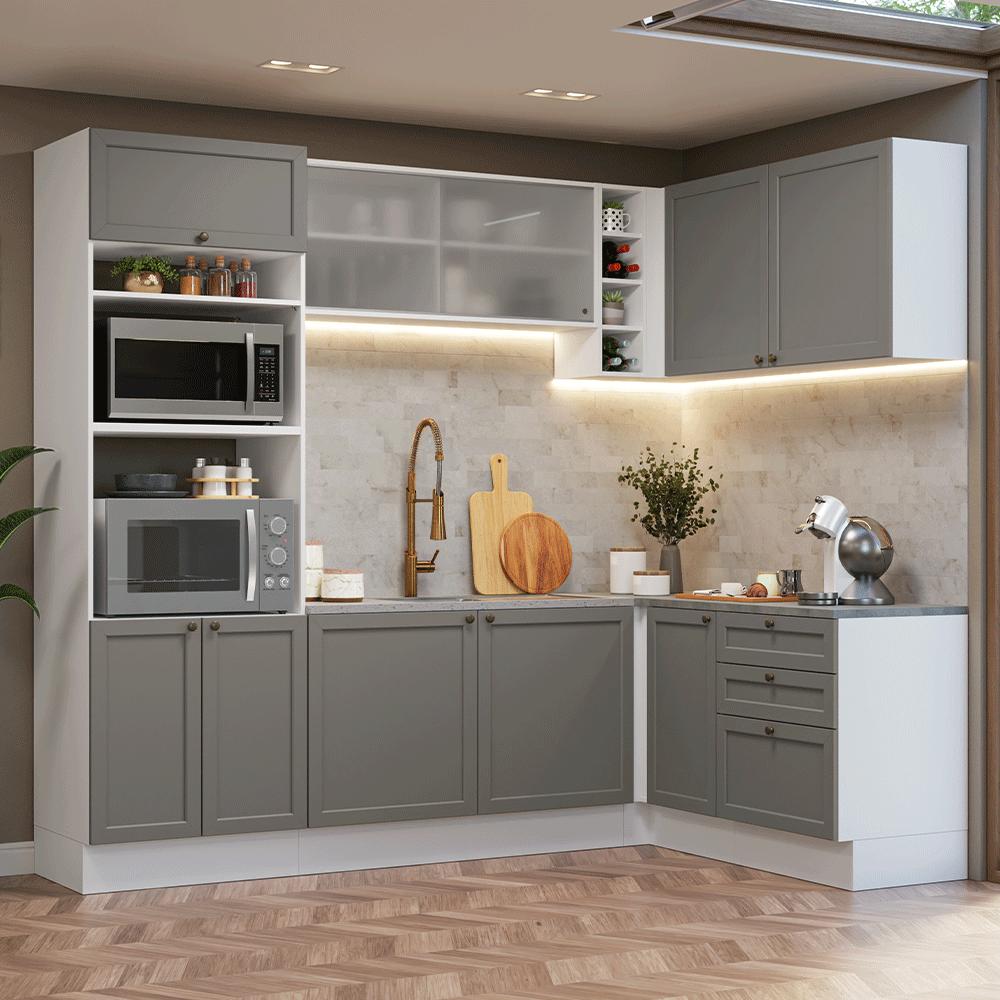 Armário de Cozinha Completa de Canto 399 cm Branco/Cinza Vik Madesa 01