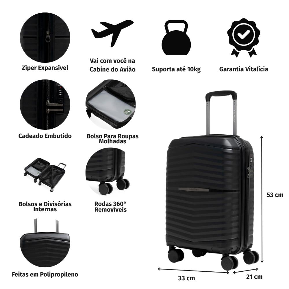 Mala de Bordo 10 Kg Polipropileno 4 Rodas Hong Kong Preta