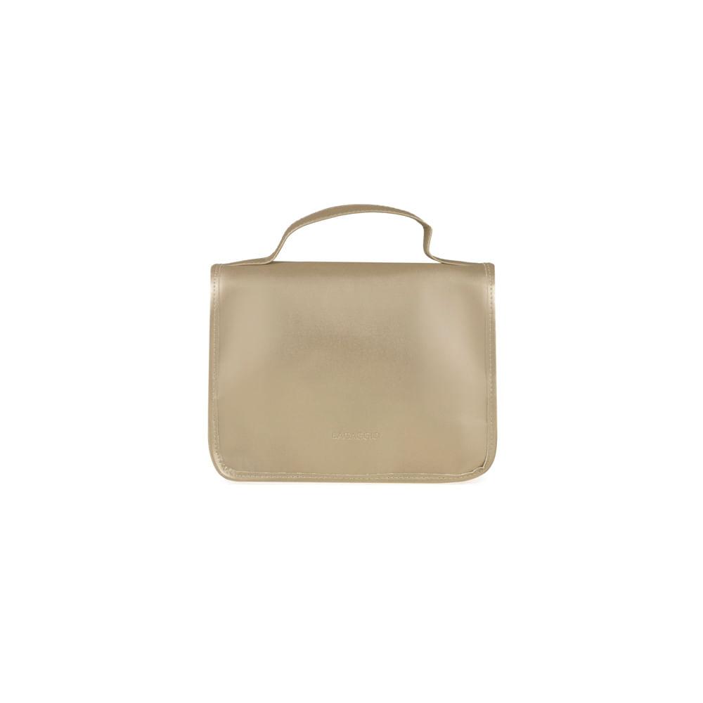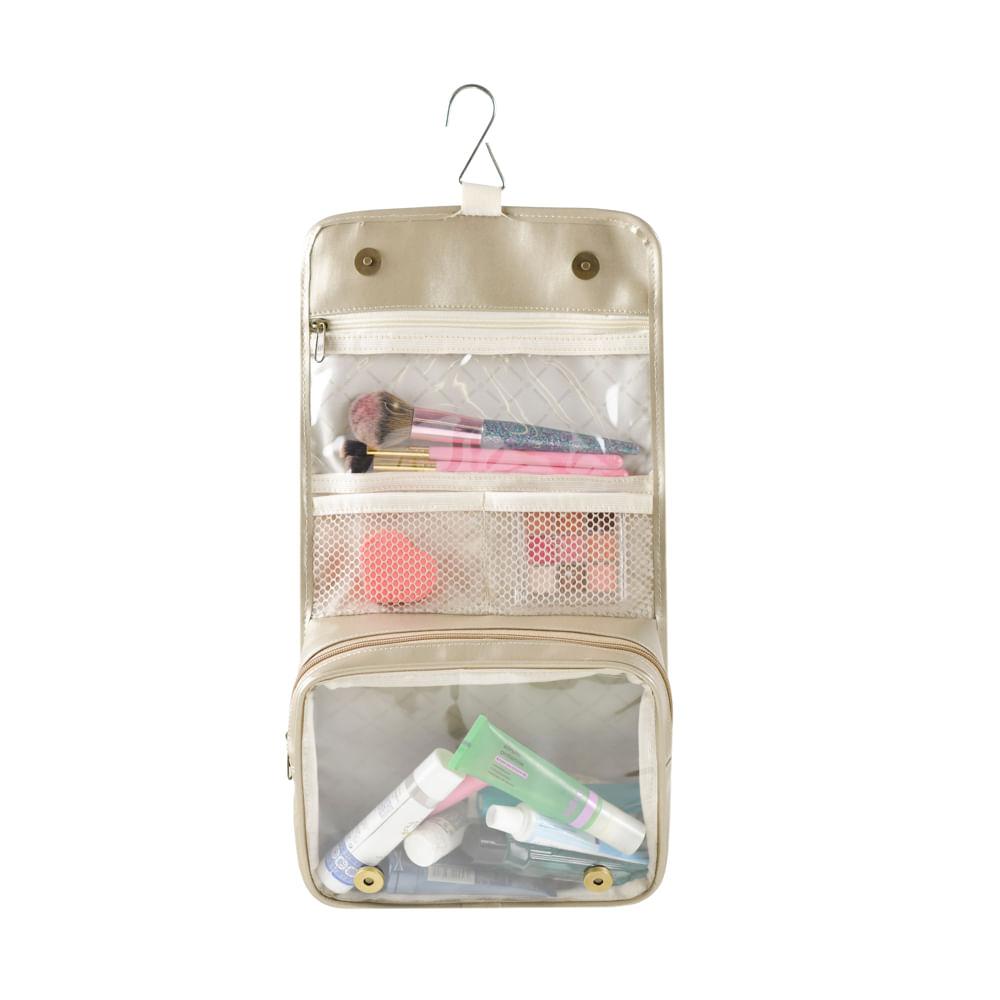 Necessaire para Organização com Gancho Golden Glow DouradoPrática e elegante, ideal para organizar itens de higiene e cosméticos. Possui gancho para pendurar, facilitando o uso em viagens e no dia a dia. Design funcional com ótimo aproveitamento de espaço e acabamento sofisticado na cor dourada.Especificações: Material: Sintético Peso (kg): 0,6kgDimensões: 19 x 24 x 9 cmCapacidade: 4,1L Cor: DouradoMarca: Bagaggio Faixa Etária: Adulto Outros atributos: - Compartimento interno com divisórias. - Bolsos transparentes.