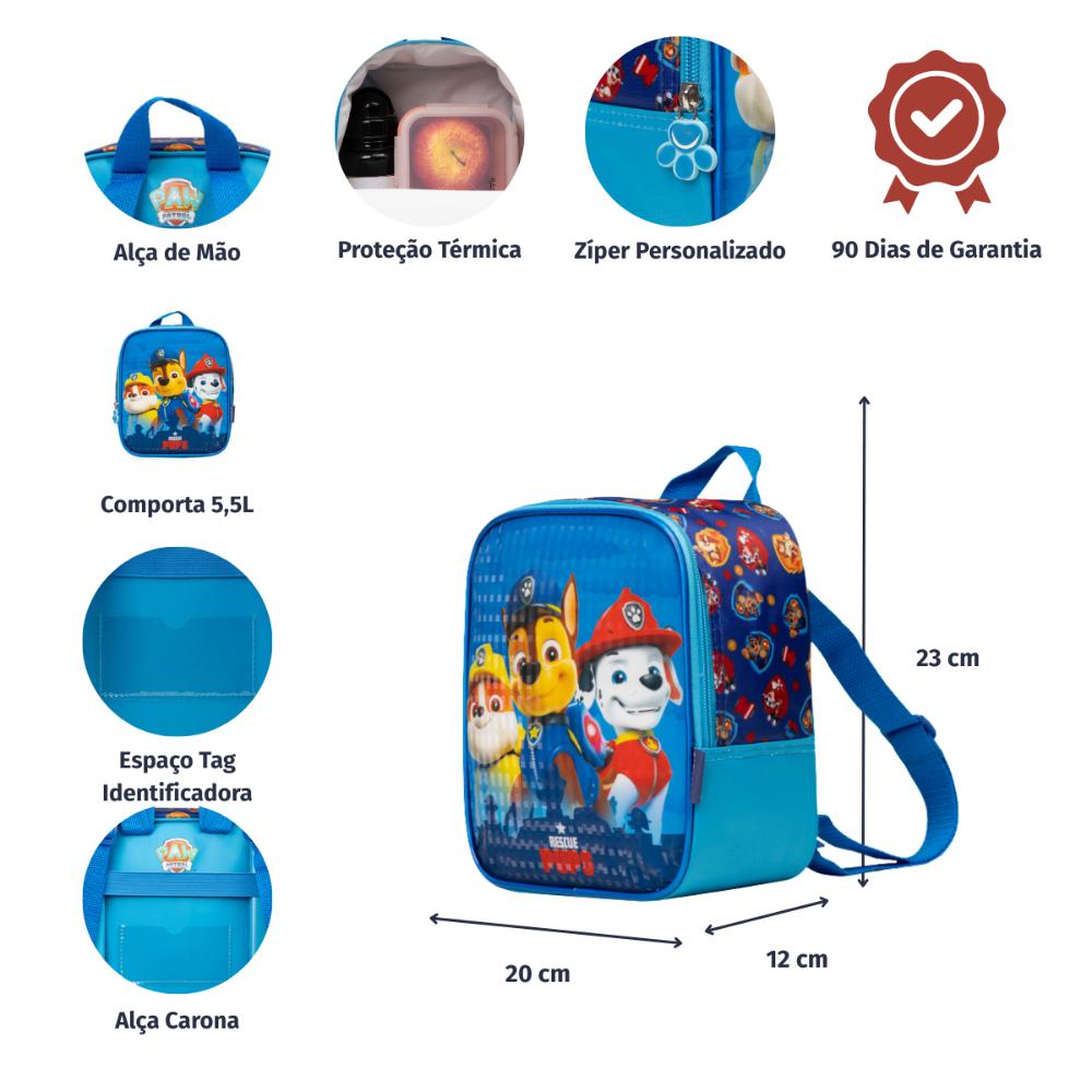 Lancheira Térmica Infantil Masculina Patrulha Canina Chase e Equipe Azul0152633030001 A Lancheira Patrulha Canina mantém seus alimentos frescos e saborosos enquanto seu filho está na escola ou em qualquer lugar. Com um design prático e funcional, esta lancheira térmica oferece uma maneira divertida de levar as refeições diárias dos pequenos. Tamanhos disponível: 23 x 20 x 12 cm Principais Atributos Alça Mão Com a Alça para mão é possível você carregar a lancheira com maior facilidade. Bolso Frontal A lancheira conta com um amplo bolso frontal externo para acomodar itens para fácil acesso. Proteção térmica Projetada para mantér a temperatura de seus alimentos e bebidas por muito mais tempo, a proteção térmica é ideal para quem tem um rotina agitada na rua e prefere carregar sua própria comida. Diferenciais Alça transversal Conta com alça transversal, sendo possível carregar a lancheira no ombro, com maior facilidade.p> Bagaggio responde Essa lancheira da Bagaggio tem garantia? Sim, a lancheira conta com 90 dias de garantia para defeitos de fábrica. Qual litragem essa lancheira comporta? A lancheira comporta até 5L. Quanto pesa esta lancheira? A lancheira conta com um peso de 190g.