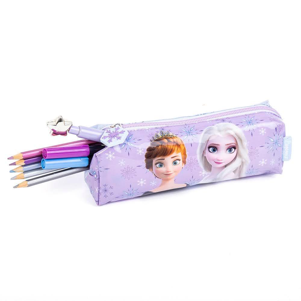 A hora de estudar vai ficar ainda mais divertida com o estojo Disney Frozen II. Feito em PVC, material bastante resistente e durável, tem o selo do INMETRO certificando a qualidade e segurança do produto. Com design exclusivo da Bagaggio, seus puxadores são personalizados e de borracha. Compacto e pensado para não ocupar muito espaço na mochila, ele possui amplo espaço interno para acomodar todos os lápis, canetas e acessórios.