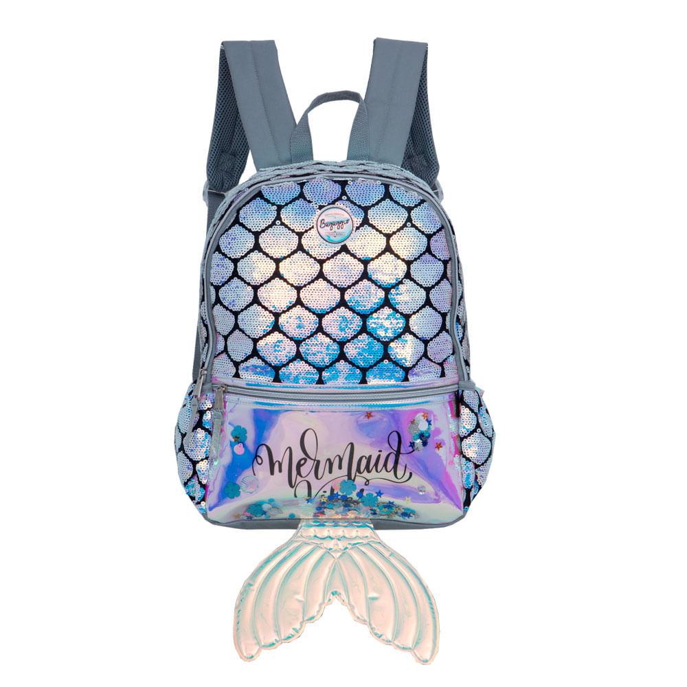 A sua pequena sereia vai amar a Mochila Mermaid. O modelo é confeccionado em paetê com desenhos que simulam escamas. Possui um compartimento principal e um bolso frontal com material transparente e mix de paetês. Conta, com dois bolsos laterais em elástico para guardar garrafas. Para dar o toque final, sua base possui uma linda cauda 3D de sereia toda produzida com material especial holográfico. Seu espaçamento interno é perfeito para transportar cadernos, mochilas e outros itens escolares. DIFERENCIAIS: - Cauda de sereia em 3D; - Estampa em paetê holográfico; - Bolso frontal com material transparente holográfico e mix de paetês; - Dois bolsos laterais com elástico para garrafas; - Alças das costas reguláveis; - Alça de mão; - Puxadores personalizados; - Forro em nylon; - Amplo espaço interno.