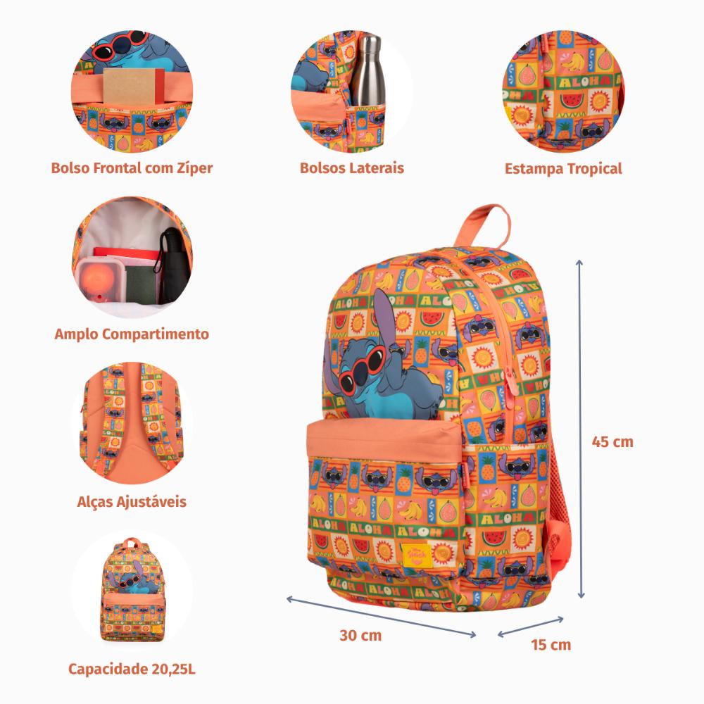 Mochila Escolar Feminina Juvenil Stitch Tropical Rosa Com a Mochila Básica Tropical Stitch, você leva o espírito divertido e alegre do personagem Stitch para o seu dia a dia! Com uma estampa tropical vibrante e detalhes encantadores, esta mochila é perfeita para crianças e fãs da animação que buscam um acessório estiloso e funcional. Tamanhos disponíveis: 45 x 30 x 15 cm Principais Atributos - Estampa Exclusiva Tropical A mochila apresenta uma estampa divertida com o Stitch usando óculos de sol, rodeado de frutas e símbolos tropicais, criando uma vibe descontraída e cheia de cor. - Amplo Compartimento Principal O compartimento principal espaçoso é ideal para carregar cadernos, livros e outros itens essenciais, tornando-a perfeita para uso escolar ou atividades diárias. - Bolso Frontal com Zíper Com um bolso frontal prático e de fácil acesso, você pode organizar pequenos objetos como lápis, chaves ou celular de forma rápida e segura. - Alças Ajustáveis e Acolchoadas As alças da mochila são acolchoadas e ajustáveis, proporcionando maior conforto durante o uso, especialmente em longos períodos. Bagaggio Responde - O material é impermeável? O material da mochila é resistente e fácil de limpar, garantindo proteção básica para seus itens, mas não é impermeável. - A mochila tem garantia? Sim, a lancheira térmica conta com 90 dias de garantia para defeitos de fábrica.