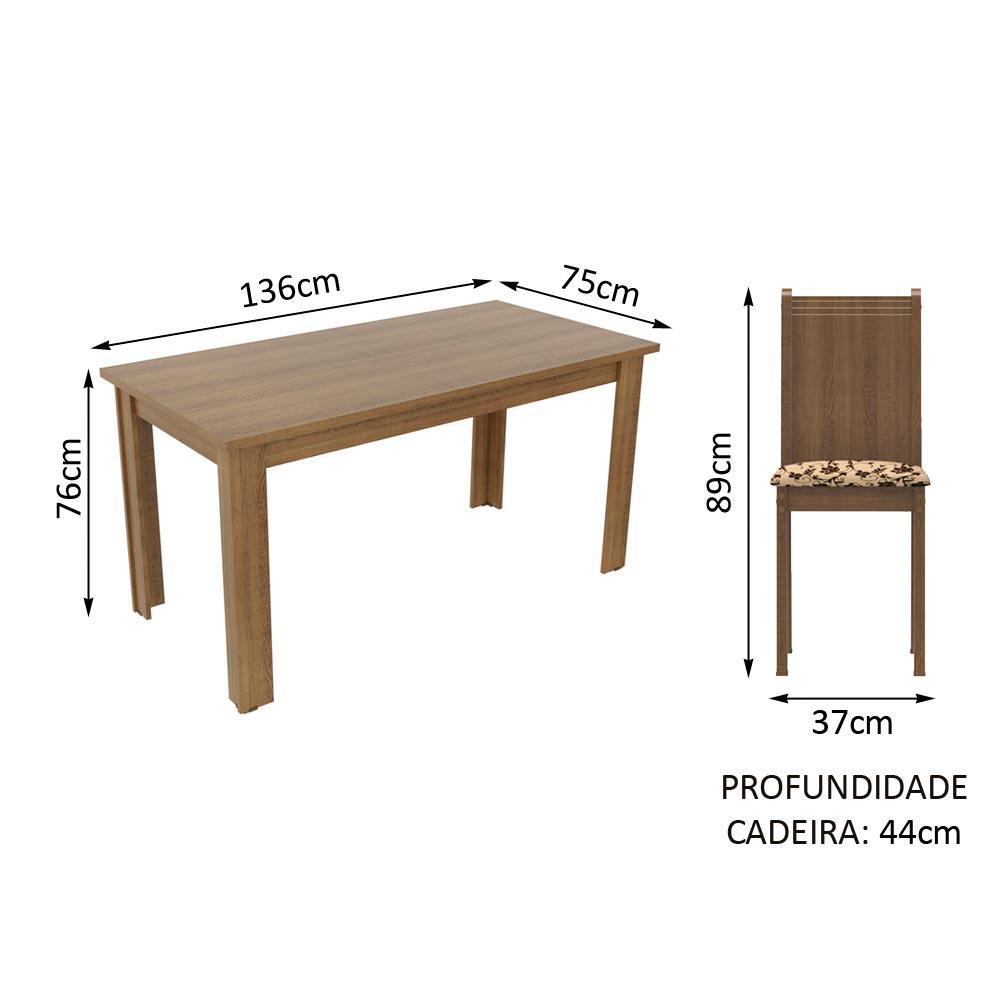 O Conjunto de Mesa com Cadeiras Rosie é a opção sob medida para você. O tamanho é ideal para ambientes mais compactos. A mesa de madeira é firme e o formato possibilita acomodar mais dois lugares. Para ganhar ainda mais espaço, a sugestão é utilizar encostada na parede, tanto na cozinha quanto na sala de jantar. O destaque fica para a cadeira de madeira com detalhe no encosto e assento estofado com opções neutras, estampas modernas e cores vibrantes para harmonizar com qualquer decoração. Disponível em diversas combinações de estampas e tons, se destaca pelo design moderno e a praticidade no dia a dia. Itens inclusos: - Uma (1) mesa de madeira de 76 cm de altura e tampo de madeira de 136 cm x 75 cm. - Quatro (4) cadeiras de madeira de 89 cm de altura com assento estofado.Código do produto: 044705ZXTFBM Obs.: A Madesa não disponibiliza serviço de montagem.1-O produto é novo ou usado?R.: Todos os produtos da Madesa são novos, enviados da nossa fábrica diretamente para as casas de nossos clientes.2-O produto vem montado? Se não, vocês realizam a montagem?R.: A Madesa não disponibiliza serviço de montagem. Todos os produtos seguem com manual de instalação e as ferragens necessárias. Alguns produtos possuem vídeo explicando o passo a passo da montagem.3-Vocês possuem loja física? Posso retirar meu produto em mãos?R.: Não possuímos loja física, apenas loja virtual. Confira as opções de envio ao colocar o seu CEP.4-Qual é o valor do envio? Posso pagar separadamente?R.: O valor do envio é calculado com base no peso e volume do produto, e no CEP de destino. Você pode calcular o valor e prazo de entrega no simulador.5-A Madesa entrega em todo Brasil? Como é feita a entrega?R.: Sim, entregamos no Brasil inteiro através de transportadoras parceiras.6-O produto acompanha Nota Fiscal?R.: Sim, todos os produtos são entregues com suas respectivas notas fiscais.7-Os produtos possuem garantia?R.: Sim. A Madesa oferece 3 meses de garantia para defeitos de fabricação.A Madesa se dedica à sustentabilidade com várias iniciativas: temos uma usina própria para gerar energia que abastece uma de nossas fábricas. Selecionamos nossos fornecedores, priorizando aqueles que possuem um compromisso com a sustentabilidade e proteção do meio ambiente. Todo o plástico utilizado no setor produtivo é proveniente de reciclagem e as suas sobras são encaminhadas ao fornecedor que os recicla. Também investimos no desenvolvimento contínuo de nossos colaboradores e em ações educacionais que beneficiem a comunidade.