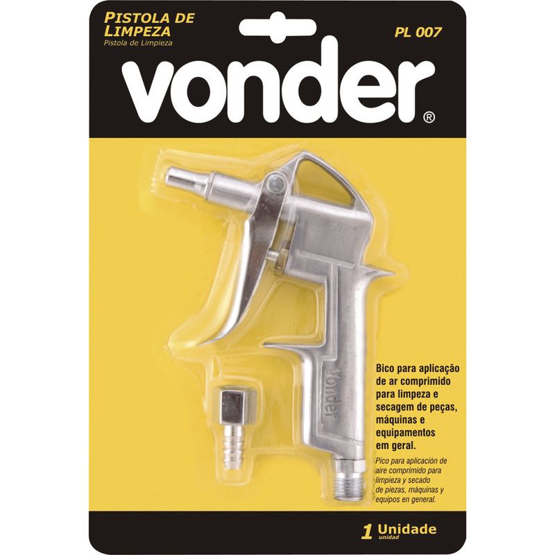 Pistola de Limpeza de Ar em Alumínio com Bico Curto e Gatilho VD-7 - VonderDescubra a eficiência e praticidade da Pistola de Limpeza de Ar VD-7 da Vonder, uma ferramenta essencial para quem busca qualidade e durabilidade em suas atividades de limpeza. Com um corpo robusto em alumínio, esta pistola é ideal para limpezas de máquinas e equipamentos, garantindo um desempenho superior e resistência à corrosão. O acionamento por gatilho proporciona facilidade de uso, permitindo um controle preciso do fluxo de ar. A Vonder é uma marca reconhecida por sua excelência em ferramentas e equipamentos, oferecendo produtos que atendem às necessidades dos profissionais mais exigentes. Com a Pistola de Limpeza VD-7, você terá em mãos um equipamento confiável e eficiente, que facilitará suas tarefas diárias.ESPECIFICAÇÕES TÉCNICAS:- Marca: Vonder- Modelo: 7893946026721- Material do corpo: Alumínio- Rosca de entrada de ar: 1/4" NPT (macho)- Tipo de acionamento: Gatilho- Pressão máxima de trabalho: 60 lbf/pol²FUNÇÕES E CARACTERÍSTICAS:- Ideal para limpeza de máquinas e equipamentos- Corpo em alumínio resistente à corrosão- Acionamento por gatilho para maior controleCOMPATIBILIDADE:- Compatível com sistemas de ar comprimido com rosca 1/4" NPTINSTRUÇÕES DE USO:1. Conecte a pistola ao compressor utilizando a rosca 1/4" NPT.2. Certifique-se de que a pressão do ar não exceda 60 lbf/pol².3. Acione o gatilho para iniciar a limpeza.4. Após o uso, desconecte a pistola e armazene em local seco.ITENS INCLUSOS:- 1 Pistola de ar para limpeza- Espigão giratório rosca ¼? NPT interno (fêmea) com espiga para mangueira diâmetro 5/16?