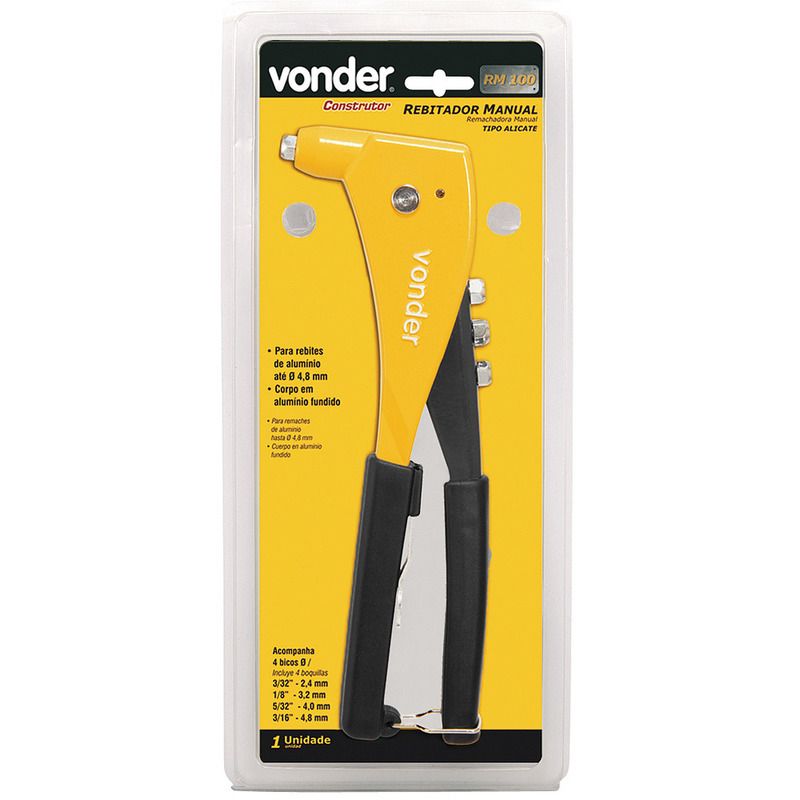 Conteúdo da embalagem1 Rebitador. Acompanha: 1 bico de 2,4 mm (3/32"), 1 bico de 3,2 mm (1/8"), 1 bico de 4,0 mm (5/32"), 1 bico de 4,8 mm (3/16") e 1 chave.Aplicações e dicas de usoIndicado para unir peças, como: chapas, tubos, perfis, entre outras, através de rebites de repuxoDestaques e diferenciaisPossui corpo em alumínio fundido, proporcionando mais leveza e excelente resistência mecânica e à oxidação/corrosão DETALHES TÉCNICOS Material do corpo do rebitador: Alumínio fundido Quantidade de bicos do rebitador: 04 bicos Comprimento total do rebitador: 250,0 mm Altura do rebitador: 80,0 mm Diâmetro máximo de rebite: 4,8 mm Tipo do rebite indicado: Alumínio, aço e aço inox