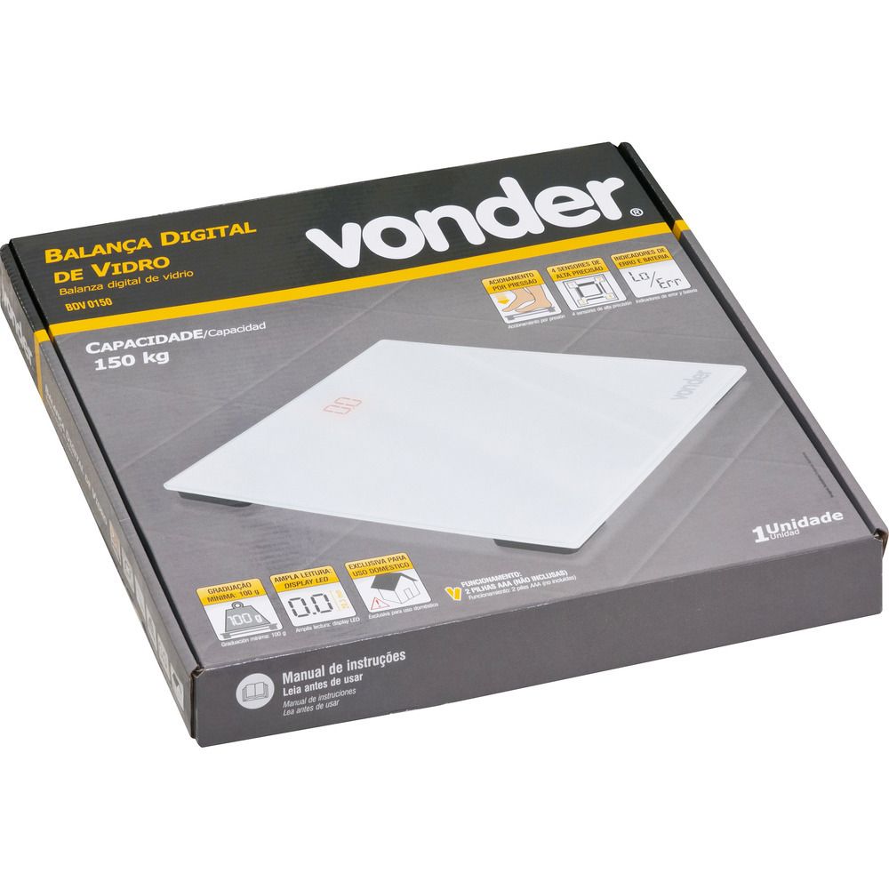 Balança Digital de Vidro 310x300mm 150kg - VonderDescubra a precisão e a elegância da Balança Digital de Vidro Vonder, projetada para oferecer medições confiáveis e um design moderno que complementa qualquer ambiente. Com capacidade máxima de 150 kg, esta balança é ideal para uso doméstico, garantindo que você acompanhe seu peso com facilidade e precisão. A plataforma de vidro temperado não só proporciona durabilidade, mas também um toque de sofisticação ao seu banheiro ou quarto.A Balança Digital Vonder é equipada com 4 sensores de alta precisão acionados por pressão, assegurando medições exatas a cada uso. O display de LED oferece uma leitura clara e ampla, facilitando a visualização dos resultados. Além disso, a balança possui indicadores de erro e bateria, garantindo que você esteja sempre informado sobre o estado do dispositivo.Para aqueles que buscam praticidade, a balança é alimentada por pilhas, tornando-a fácil de manter e usar. Embora as pilhas não estejam inclusas, a substituição é simples e rápida. A balança não é pediátrica, sendo indicada exclusivamente para adultos.ESPECIFICAÇÕES TÉCNICAS:- Marca: Vonder- Código universal de produto: 7893946352578- Altura: 2 cm- Comprimento: 31 cm- Largura: 30 cm- Capacidade máxima de peso: 150 kg- Tipo de balança: Digital- Com tela digital: Sim- Material: Vidro temperado- Tipos de alimentação: PilhaFUNÇÕES E CARACTERÍSTICAS:- Sensores de alta precisão- Display de LED com ampla leitura- Indicadores de erro e bateriaINSTRUÇÕES DE USO:1. Coloque a balança em uma superfície plana e firme.2. Suba na balança descalço e permaneça imóvel até que a leitura seja exibida.3. Para obter medições precisas, pese-se sempre no mesmo horário e condições.4. Evite expor a balança a umidade excessiva ou calor extremo.ITENS INCLUSOS:- 1 Balança digital