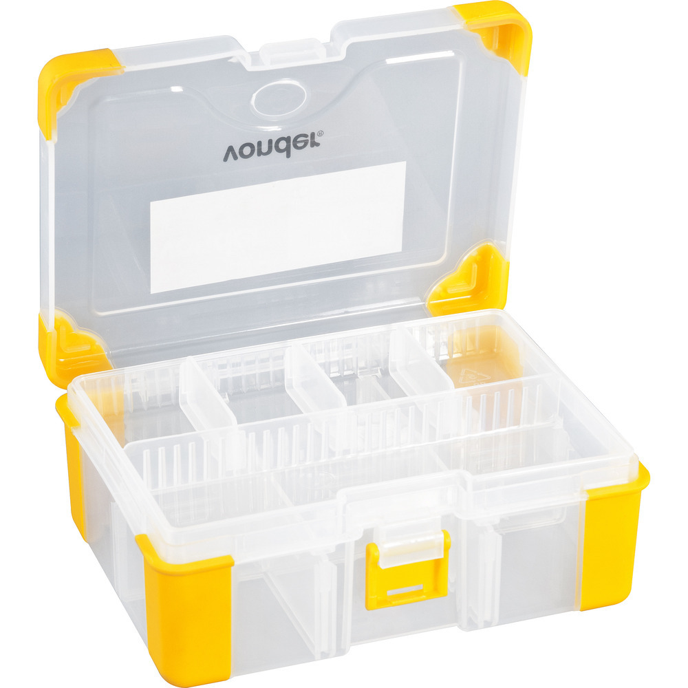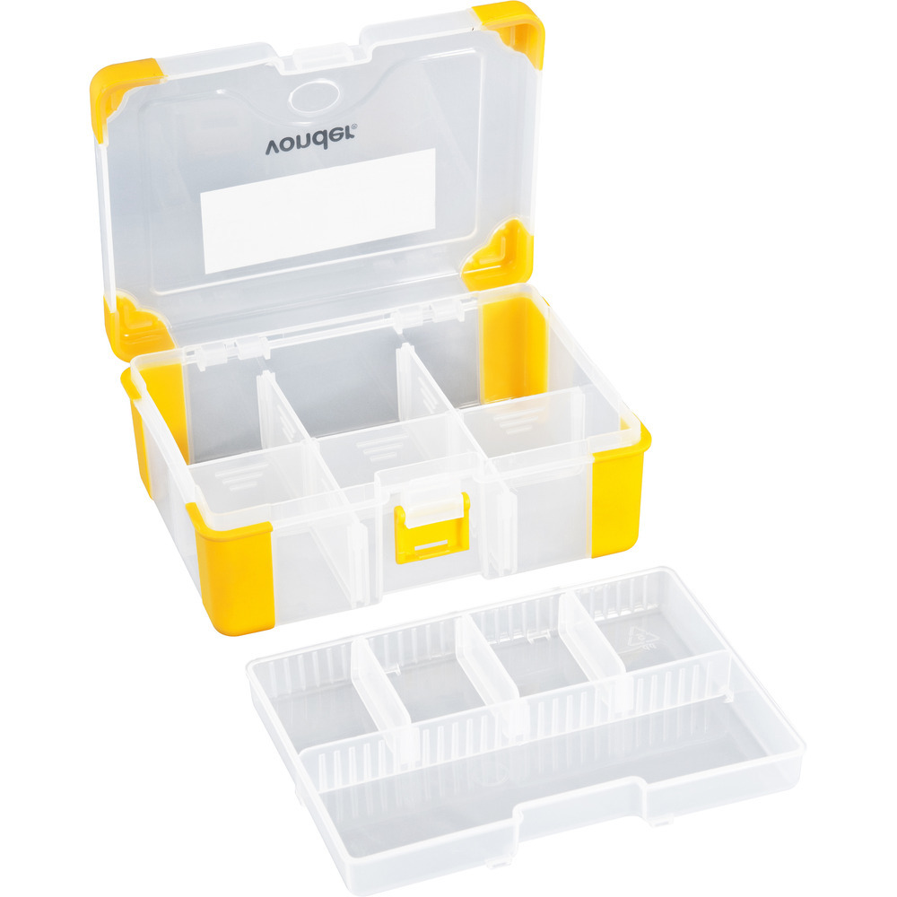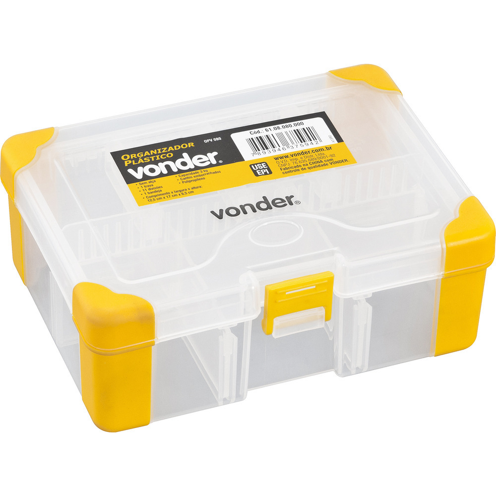 Conteúdo da embalagem1 Organizador plásticoAplicações e dicas de usoIndicado para acondicionar peças e acessórios de pequeno porte, material de pesca, parafusos, pregos, porcas, remédios, entre outrosDestaques e diferenciaisPossui 11 divisões, 1 trava, cantos emborrachados, 1 bandeja e capacidade para 3 kg DETALHES TÉCNICOS Comprimento do organizador para ferramentas: 170,0 mm Largura do organizador para ferramentas: 125,0 mm Altura do organizador para ferramentas: 65,0 mm Material do organizador para ferramentas: Polipropileno com cantos emborrachados Cor do organizador para ferramentas: Transparente e amarelo Capacidade de carga: 3 kg