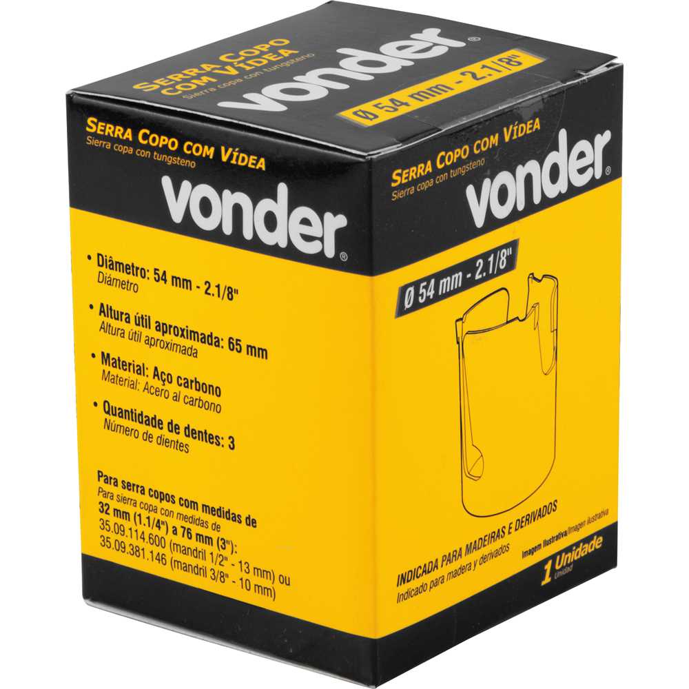 Conteúdo da embalagem1 Serra copoAplicações e dicas de usoIndicada para madeiras e derivados. Utilizar suporte/haste e broca piloto apropriados (não acompanham).Destaques e diferenciaisPossui dentes de metal duro/vídea que proporcionam maior vida útil. Permite a realização de furos com grandes diâmetros em tempo reduzido. O número de dentes pode variar de acordo com o diâmetro da serra copo. DETALHES TÉCNICOS Diâmetro da serra copo: 2.1/8" - 54 mm Altura útil aproximada da serra copo: 65 mm Diâmetro da serra copo: 2.1/8" - 54 mm Altura útil aproximada da serra copo: 65 mm