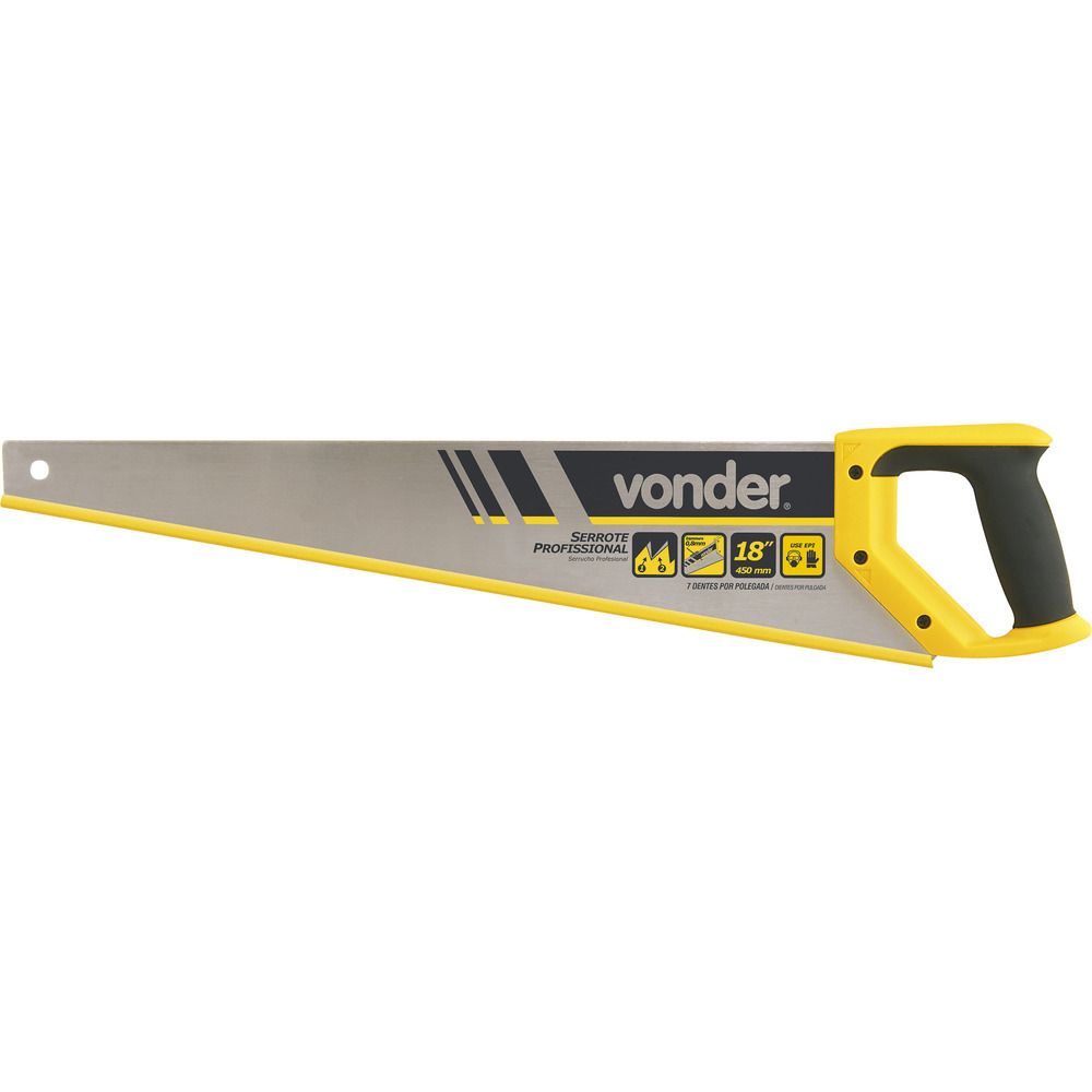 Conteúdo da embalagem1 Serrote Aplicações e dicas de usoIndicado para cortes em madeirasDestaques e diferenciaisCabo ergonômico em plástico rígido ABS, recoberto com borracha termoplástica, proporcionando maior conforto no manuseio. Conta com referência rápida de ângulos no cabo de 45° e 90°. Lâmina em aço temperado com dentes travados com dupla afiação, conferindo um corte mais rápido. DETALHES TÉCNICOS Material da lâmina do serrote: Lâmina de aço temperado Material do cabo do serrote: Plástico rígido ABS Comprimento de corte do serrote: 18" - 457 mm Número de dentes por polegada: 7 dentes