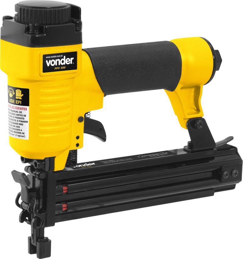 Conteúdo da embalagem1 Pinador pneumáticoAplicações e dicas de usoIndicado para fixação de forros, rodapés, montagem de cadeiras, gavetas, filetes e vistas de portas, molduras, esquadrias de madeira, finalização de móveis, entre outros. Mantenha a ferramenta constantemente lubrificada e utilize sempre o regulador de pressão e o lubrificador de linha com óleo pneumático. Utilizar somente pinos tipo "F" marca Vonder apropriados para este equipamento.Destaques e diferenciaisPossui corpo em alumínio e empunhadura emborrachada que proporciona resistência e conforto. Conta com sistema de abertura rápida do cabeçote que facilita o destravamento dos pinos quando necessário. Possui ainda ajuste de profundidade do pino, indicador de término dos pinos, direcionador de escape de ar e sistema de segurança que só permite o acionamento do pinador quando pressionado à peça, evitando disparos involuntários. DETALHES TÉCNICOS Pressão de trabalho do pinador pneumático: 60 lbf/pol² a 100 lbf/pol² = 4 kgf/cm² a 7 kgf/cm² Consumo de ar do pinador pneumático: 0,27 PCM (pé³/min) Tipo e tamanho de pino indicado: Tipo" F" de 15 mm a 30 mm Capacidade aproximada de armazenamento do pinador pneumático: 100 pinos Rosca de entrada de ar do pinador: 1/4" NPT rosca interna (fêmea) Peso aproximado: 1,1 kg Prazo de garantia: 6 meses