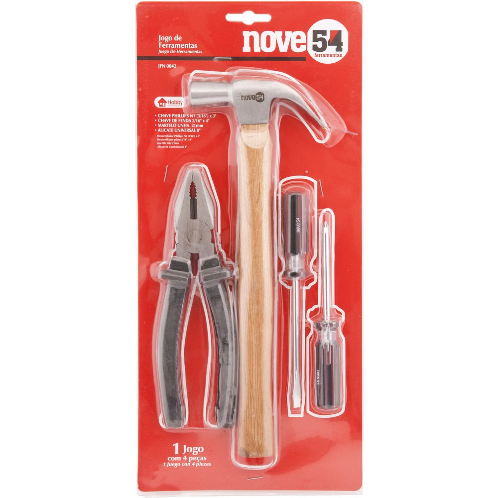 Conteúdo da embalagem1 Jogo de ferramentas com 4 peças, sendo: 1 chave de fenda aço carbono 3/16" x 4", 1 chave de fenda cruzada/phillips aço carbono 3/16" x 4", 1 martelo unha 21 mm cabo de madeira e 1 alicate universal aço carbono 8"Aplicações e dicas de usoIndicado para manutenções e reparos em geral. Uso leve. DETALHES TÉCNICOS Quantidade de peças do jogo de ferramentas: 4 peças