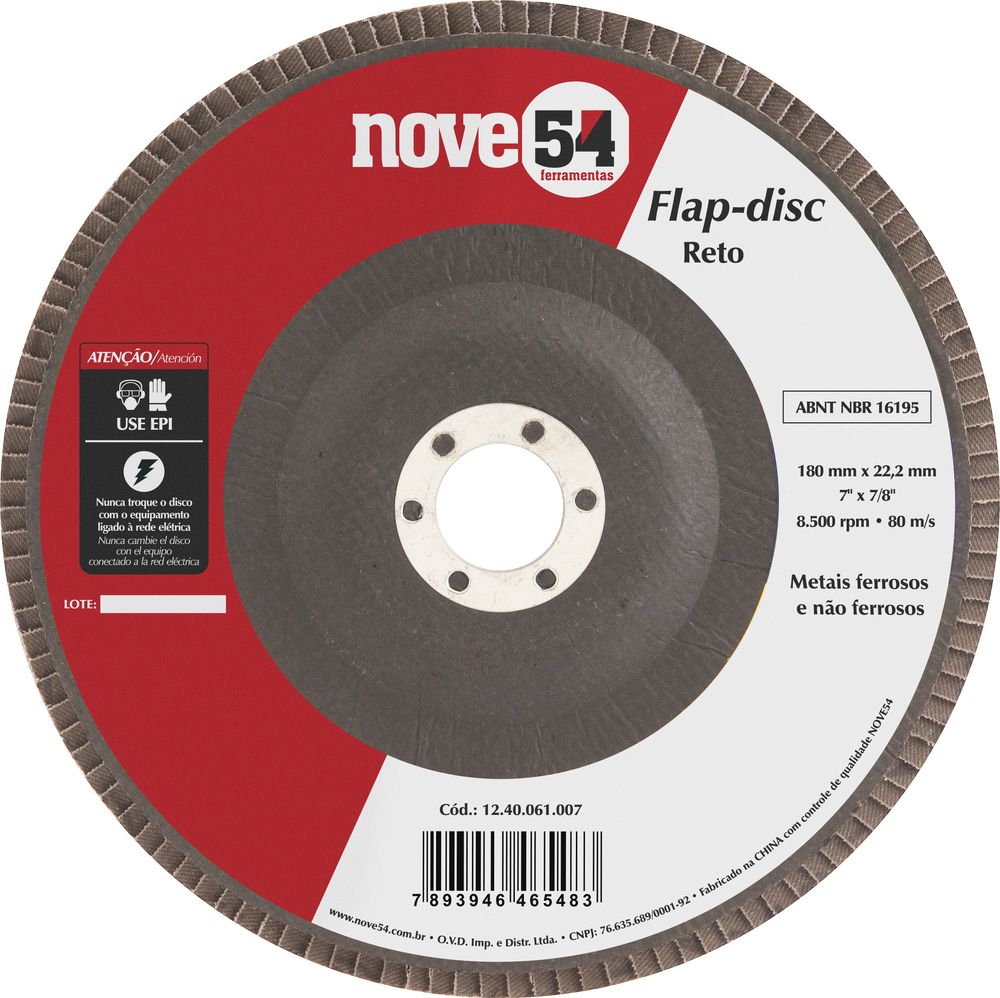 Conteúdo da embalagem1 Disco de desbaste/acabamento flap-discAplicações e dicas de usoIndicado para desbaste e acabamento em metais ferrosos e não ferrosos, como: alumínio, latão, ferro, aço, entre outros. Não indicado para aço inox.Destaques e diferenciaisPermite atividades de desbaste e acabamento ao mesmo tempo, eliminando a troca de discos. Proporciona menor vibração e ruído comparado com o disco de desbaste convencional. DETALHES TÉCNICOS Diâmetro externo do disco de desbaste/ acabamento flap-disc : 7" - 177 mm Diâmetro do furo do disco de desbaste/ acabamento flap-disc : 7/8" - 22,2 mm Grão: G 40 Tipo de costado: Fibra Tipo do perfil do disco de desbaste/acabamento flap-disc: Reto Tipo do grão abrasivo: Óxido de alumínio Rotação máxima (rpm): 8500 rpm Norma de referência: ABNT NBR 15635 / ABNT NBR 16195