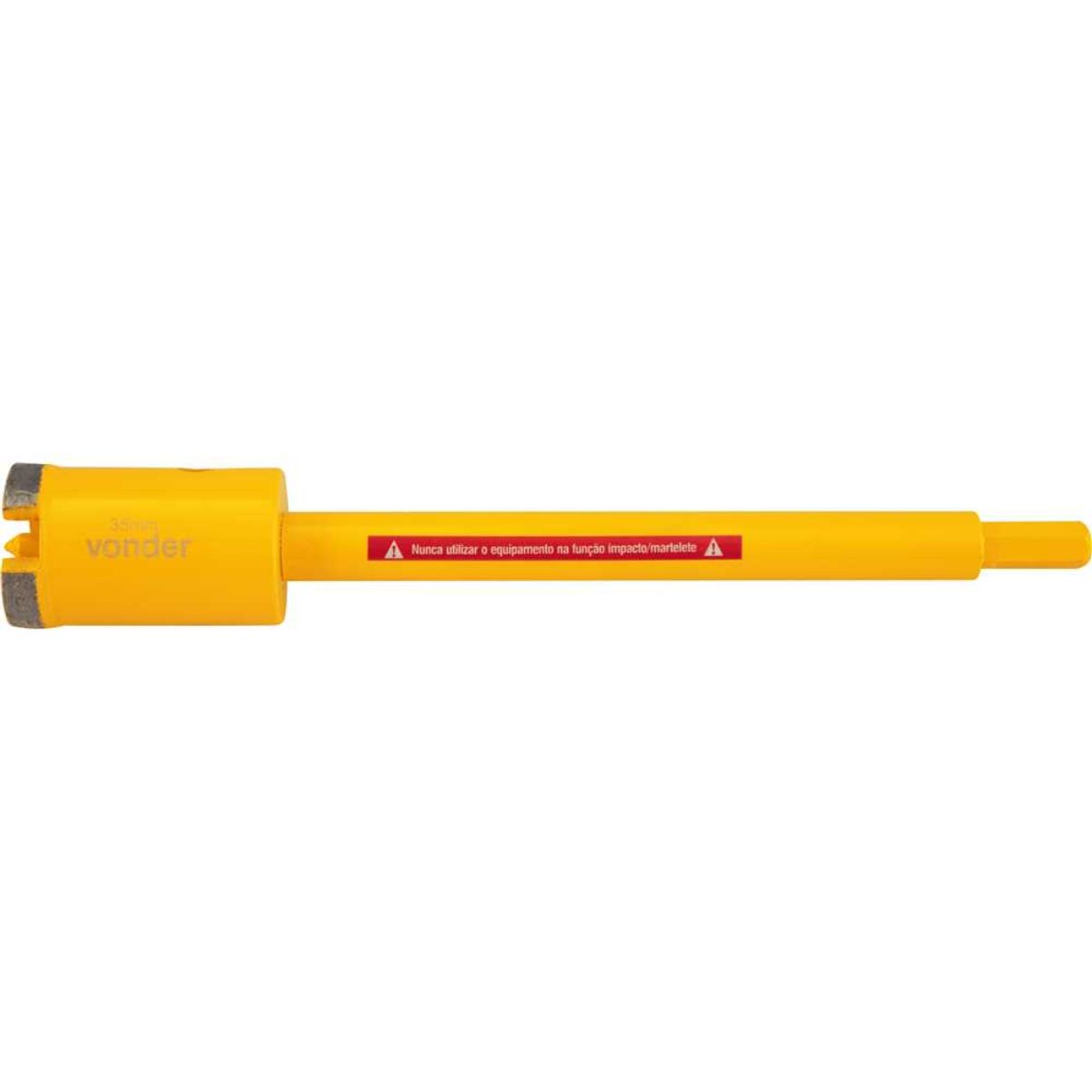 Código do Fornecedor: 3617100035Marca: VonderConteúdo da embalagem: 1 Serra copo diamantada com haste e pino guiaDETALHES TÉCNICOS• Diâmetro: 35,00 mm• Altura Útil Aproximada: 58,00 mm• Material da Serra Copo: Corpo metálico com dentes diamantados (Aço carbono C45)• Comprimento Total da Haste: 170,00 mm• Diâmetro do Encaixe da Haste: 9,50 mm• Diâmetro da Haste: 14,5 mm• Altura da Camada de Diamante: 6,00 mm• Tipo de Haste: SextavadaAPLICAÇÕES E DICAS DE USOA Serra Copo Diamantada é ideal para cortar telhas, tijolos, cerâmicas, azulejos, granitos e outros materiais similares com alta eficiência e durabilidade. Graças ao corpo reforçado em aço e ao segmento diamantado prensado a quente, o equipamento oferece maior vida útil e realiza furos de grandes diâmetros em tempo reduzido.Para cortes precisos, utilize o pino guia e faça um furo inicial com broca de vídea. É importante destacar que o equipamento não deve ser utilizado na função impacto ou martelete, e não é indicado para cortes em porcelanato.DESTAQUES E DIFERENCIAIS• Corpo Reforçado em Aço: Oferece resistência e durabilidade.• Segmento Diamantado Prensado a Quente: Maior eficiência em cortes.• Facilidade de Uso: Ideal para furos de grandes diâmetros em menor tempo.• Compatibilidade Ampla: Perfeito para telhas, tijolos, azulejos e granitos.• Uso Preciso: Necessita pino guia e furo inicial com broca de vídea para melhor desempenho.Garantia: 3 meses.