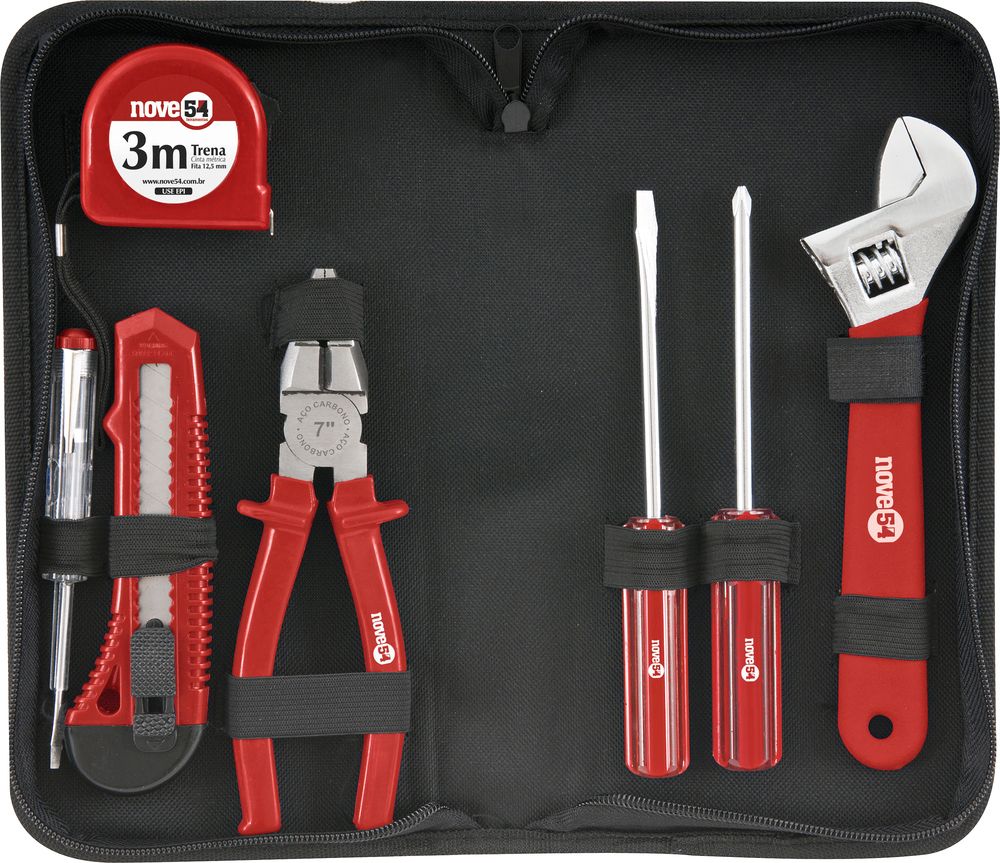 Conteúdo da embalagem1 Jogo de ferramentas com 8 peças, sendo: 1 estojo em lona, 1 trena 3 m, 1 chave teste 1/8" x 5.1/2", 1 estilete 18 mm, 1 chave de fenda em aço carbono 6 mm x 100 mm, 1 chave de fenda cruzada/phillips em aço carbono 6 mm x 100 mm, 1 alicate universal em aço carbono 7" e 1 chave ajustável em aço carbono cromada 8"Aplicações e dicas de usoIndicado para manutenções e reparos em geral. Uso hobby/doméstico.Destaques e diferenciaisAcompanha prático estojo com zíper e acomodações para todas as ferramentas DETALHES TÉCNICOS Quantidade de peças do jogo de ferramentas: 8 peças