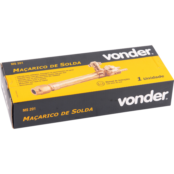 Conteúdo da embalagem1 Maçarico de solda. Acompanha: 1 conjunto de porca e niple para conexão em mangueiras.Aplicações e dicas de usoIndicado para soldagens, brasagens ou aquecimentos e cortes em geral. Trabalha tanto com gás acetileno quanto com gás GLP. Utilizado com as extensões série 201 Vonder. Indicado para trabalhos leves e médios.Destaques e diferenciaisFabricado em latão de alta resistência. Atende as exigências das normas EN 5172 / NR18 / CGA E1. DETALHES TÉCNICOS Material do maçarico de solda Corpo em latão de alta resistência