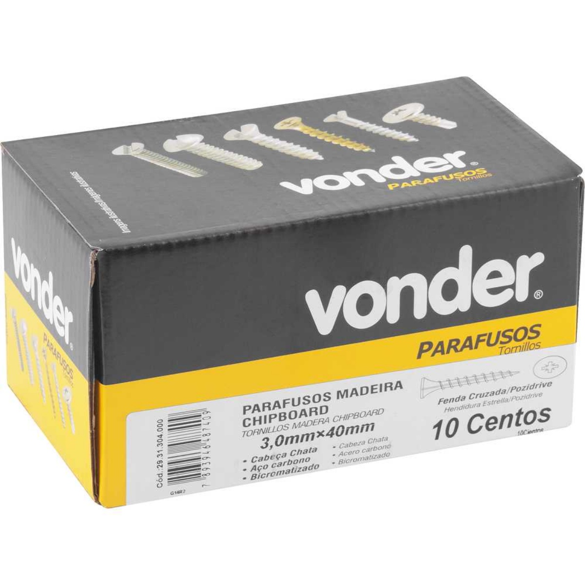 Kit Parafuso Vonder Madeira 3,0 x 40 mm Chipboard Bicromatizado 1000 PeçasConquiste fixações precisas, duráveis e seguras com o Kit de Parafusos Vonder Madeira 3,0 x 40 mm. Ideal para marceneiros, montadores de móveis, instaladores, serralheiros e profissionais da construção civil em todo o Brasil, este kit oferece excelente custo-benefício para quem exige qualidade, produtividade e acabamento impecável nos trabalhos com madeira.Cada parafuso é fabricado em aço carbono de alta resistência, garantindo fixações firmes mesmo após anos de uso. O acabamento bicromatizado (zincado amarelo) assegura uma camada protetora contra oxidação e corrosão, essencial para estruturas expostas a umidade ou ambientes internos mais agressivos.Com diâmetro de 3,0 mm e comprimento de 40 mm, esses parafusos chipboard são indicados para painéis de madeira, MDF, MDP, aglomerados e outros materiais similares. A cabeça chata com fenda cruzada/pozidrive permite maior torque durante a aplicação e encaixe perfeito da ferramenta, oferecendo mais controle e menor risco de espanar.Especificações- Tipo de cabeça: Chata - fenda cruzada/pozidrive- Diâmetro do parafuso madeira: 3,0 mm- Comprimento do parafuso madeira: 45,0 mm- Material do parafuso madeira: Aço carbono- Acabamento do parafuso madeira: Bicromatizado - zincado amareloItens inclusos- 1 Caixa com 1.000 parafusosGarantia- 03 meses com o fabricante