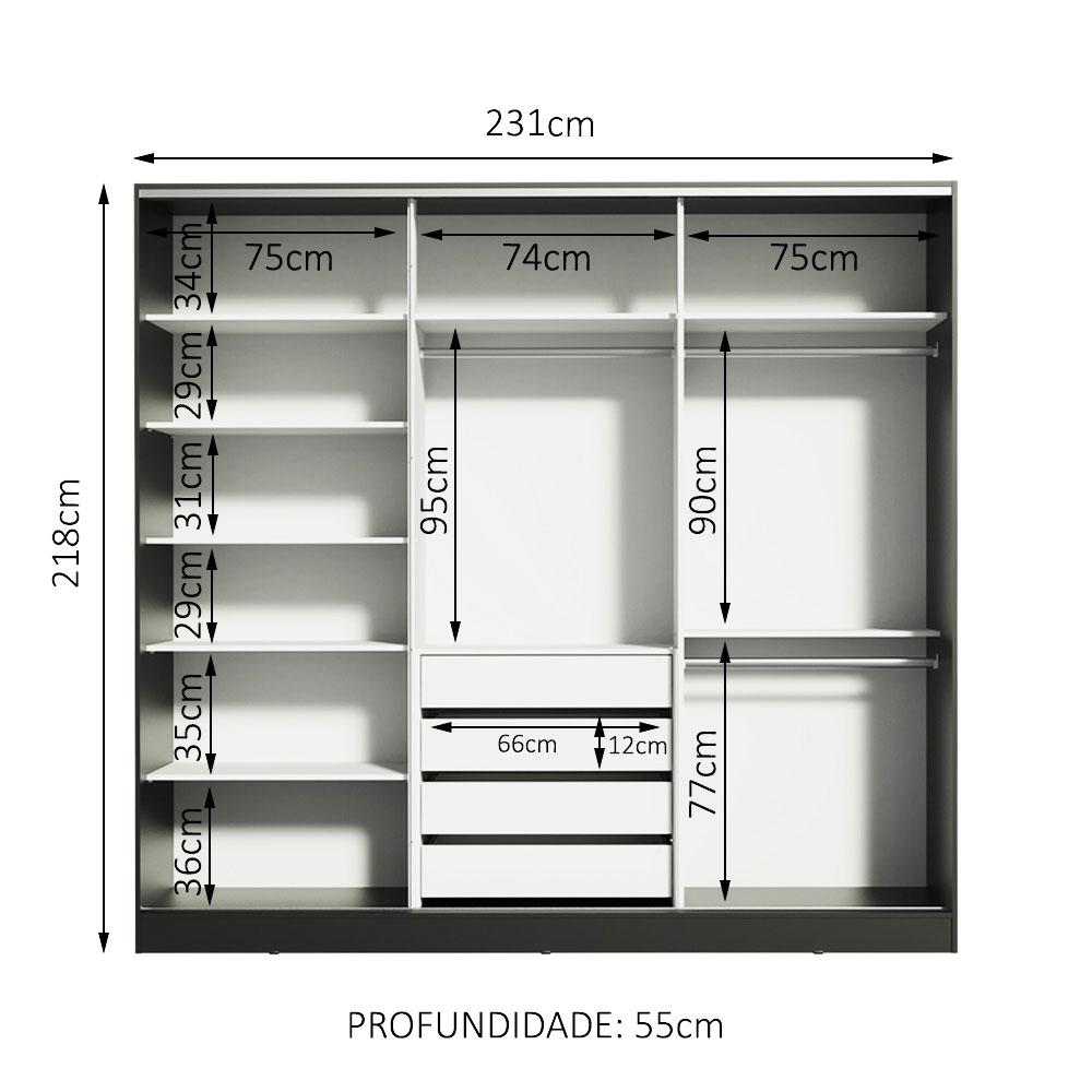 O Guarda-Roupa Casal Royale Madesa é o que estava faltando no seu dormitório. Feito em 100% MDF e com ferragens de alta qualidade. Sua distribuição interna é uma das mais espaçosas da categoria.Os tubos cabideiros são muito resistentes. A profundidade é ideal para qualquer tamanho de cabide. E para completar, são quatro gavetas muito espaçosas. Cabe tudo de forma organizada: roupas, sapatos, acessórios, edredons e travesseiros.O fechamento é com três portas de correr de madeira que ampliam o ambiente e dão um ganho de espaço enorme, sem comprometer a circulação no quarto.O acabamento da estrutura externa é preto e a parte interna é branca. As portas possuem pintura preta em um lado e branca no outro. Assim, você pode fazer a escolha no momento da montagem. O processo é feito em Pintura Poliéster de alta resistência que confere maior proteção e durabilidade ao móvel.Medidas totais do armário: 218 cm de altura x 231 cm de largura x 55 cm de profundidade.As imagens são meramente ilustrativas.Itens inclusos:- Três (3) cabideiros- Quatro (4) gavetas internas- Oito (8) prateleiras- Três (3) portas de correr, apresentando sistema anti-descarrilhamentoCódigo do produto: 10638NObs.: A Madesa não disponibiliza serviço de montagem. O produto segue com manual de instalação e todas as ferragens necessárias para sua montagem.1 – O produto é novo ou usado?R.: Todos os produtos da Madesa são novos, enviados da nossa fábrica diretamente para as casas de nossos clientes.2 – O produto vem montado? Se não, vocês realizam a montagem?R.: A Madesa não disponibiliza serviço de montagem. Todos os produtos seguem com manual de instalação e as ferragens necessárias. Alguns produtos possuem vídeo explicando o passo a passo da montagem.3 – Vocês possuem loja física? Posso retirar meu produto em mãos?R.: Não possuímos loja física, apenas loja virtual. Confira as opções de envio ao colocar o seu CEP.4 – Qual é o valor do envio? Posso pagar separadamente?R.: O valor do envio é calculado com base no peso e volume do produto, e no CEP de destino. Você pode calcular o valor e prazo de entrega no simulador.5 – A Madesa entrega em todo Brasil? Como é feita a entrega?R.: Sim, entregamos no Brasil inteiro através de transportadoras parceiras.6 – O produto acompanha Nota Fiscal?R.: Sim, todos os produtos são entregues com suas respectivas notas fiscais.7 – Os produtos possuem garantia?R.: Sim. A Madesa oferece 3 meses de garantia para defeitos de fabricação.A Madesa se dedica à sustentabilidade com várias iniciativas: temos uma usina própria para gerar energia que abastece uma de nossas fábricas. Selecionamos nossos fornecedores, priorizando aqueles que possuem um compromisso com a sustentabilidade e proteção do meio ambiente. Todo o plástico utilizado no setor produtivo é proveniente de reciclagem e as suas sobras são encaminhadas ao fornecedor que os recicla. Também investimos no desenvolvimento contínuo de nossos colaboradores e em ações educacionais que beneficiem a comunidade.