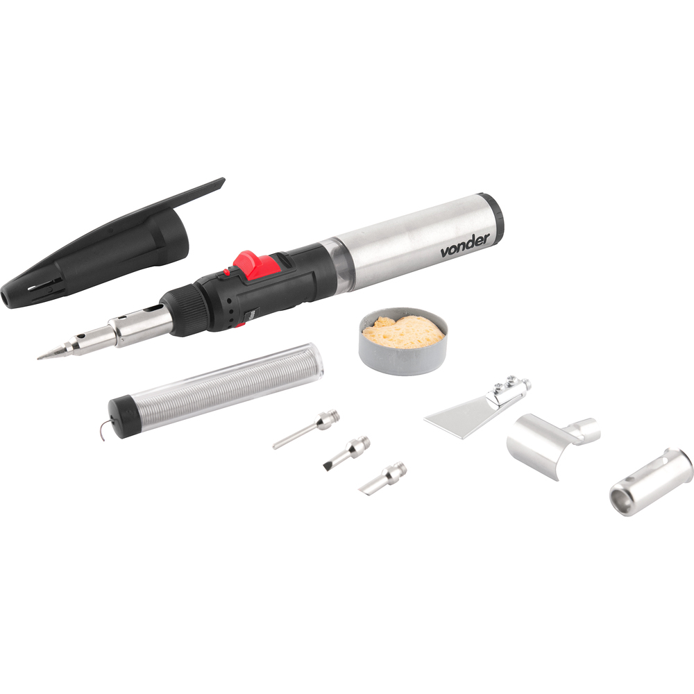 Conteúdo Embalagem:1 Maçarico, acompanha: 1 defletor, 1 ponta de solda, 1 ponta faca, 3 pontas para pirografar, 1 estanho, 1 esponja para limpeza, 1 guarda chama e 1 capa de proteçãoDestaques e diferenciais:Leve e portátil, possui acendimento automático, regulagem da chama, botão trava de segurança do gatilho e capa de proteção, o que torna o produto mais seguroAplicações e dicas de uso:Indicado para uso como ferro para solda/pirógrafo, maçarico e soprador térmicoCaracterísticas Técnicas:Material do corpo: Plástico e aço inox Material da ponta: Aço inox e aço carbono Faixa de potência: 90 W - 150 W Tipo de ignição: Automática Temperatura da chama (Ar livre): 1300ºC Temperatura ar quente: 650ºC Temperatura das pontas: 450ºC Capacidade de gás: 30 ml Tempo de operação (ajuste médio): 60 minutos Gás utilizado: Butano (refil) Método de acionamento: Gatilho manual Regulagem do gás: Manual Massa aproximada: 120 gGarantia:Garantia legal: 90 dias