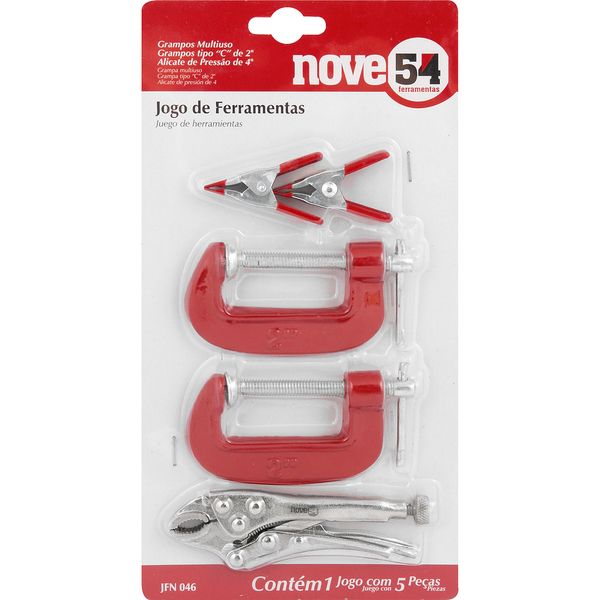 Conteúdo da Embalagem:1 Jogo de ferramentas com 5 peças, sendo: 2 grampos tipo "C" de 2", 2 grampos multiuso e 1 alicate de pressão de 4"Descrição:Jogo de ferramentas com 5 peças, JFN 046, NOVE54Aplicações e dicas de uso:Indicado para segurar, fixar, prender, travar e apertar diversos perfis de materiaisDestaques e diferenciais:Proporciona versatilidade e praticidade de uso ao operadorCaracterísticas Técnicas:Quantidade de peças do jogo de ferramentas: 5 peçasGarantia legal: 90 dias