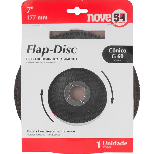 Conteúdo da Embalagem:1 Disco de desbaste/acabamento flap-discDescrição:Disco de desbaste/acabamento, flap-disc, cônico, 7", grão 60, costado de fibra, NOVE54Aplicações e dicas de uso:Indicado para desbaste e acabamento em metais ferrosos e não ferrosos, como: alumínio, latão, ferro, aço, entre outros. Não indicado para aço inox.Destaques e diferenciais:Permite atividades de desbaste e acabamento ao mesmo tempo, eliminando a troca de discos. Proporciona menor vibração e ruído comparado com o disco de desbaste convencional. Seu formato cônico permite um melhor aproveitamento do disco aumentando o rendimento.Características Técnicas:Diâmetro externo do disco de desbaste/ acabamento flap-disc: 7" - 180 mm Diâmetro do furo do disco de desbaste/ acabamento flap-disc: 7/8" - 22,23 mm Grão: G 60 Tipo de costado: Fibra Tipo do perfil do disco de desbaste/acabamento flap-disc: Cônico Tipo do grão abrasivo: Óxido de alumínio Rotação máxima (rpm): 8500 /min Norma de referência: ABNT NBR 15635 / ABNT NBR 16195Garantia legal: 90 dias