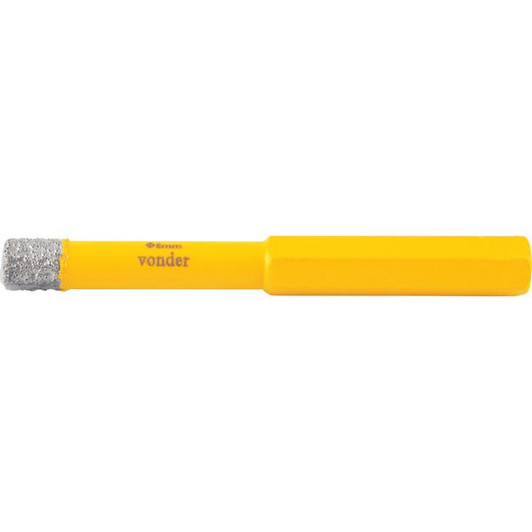 Conteúdo Embalagem: 1 Serra copo diamantada com haste Destaques e diferenciais: Possui corpo reforçado em aço, ponta com revestimento diamantado e haste sextavada Aplicações e dicas de uso: Especialmente indicada para fazer furos (corte a seco ou refrigerado) em porcelanato, cerâmica, granito e mármore. Rotação máxima (rpm): 2.500/min Características Técnicas: Diâmetro da serra copo: 8 mm Altura útil aproximada da serra copo: 39 mm Altura da camada de diamante: 10,0 mm Diâmetro da haste: 8,3 mm Diâmetro do encaixe da haste: N/A Comprimento total da haste: 41 mm Material da serra copo: Corpo em aço carbono e ponta diamantada