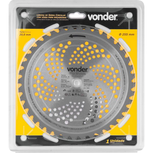 Marca:VonderConteúdo da Embalagem:1 LâminaDescrição:Lâmina circular com vídea, para roçadeiras, 255 mm x 20 mm, 40 dentes, VONDERIndicações:Indicada para roçadeiras a gasolina. Atenção: nunca toque na lâmina com o equipamento ligado.Características Técnicas:Categoria do multímetro: CAT III 600V Número de dentes da lâmina de serra circular: 40 dentes Espessura de corte da lâmina de serra circular: 2,0 mm Diâmetro do furo da lâmina de serra circular: 20 mm Rotação máxima da serra circular (rpm): 8.000/minCodigo do Forncedor:6805020040