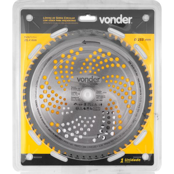 Marca:VonderConteúdo da Embalagem:1 LâminaDescrição:Lâmina circular com vídea, para roçadeiras, 255 mm x 25,4 mm, 62 dentes, VONDERIndicações:Indicada para roçadeiras a gasolina. Atenção: nunca toque na lâmina com o equipamento ligado.Características Técnicas:Categoria do multímetro: CAT III 600V Número de dentes da lâmina de serra circular: 62 dentes Espessura de corte da lâmina de serra circular: 2,0 mm Diâmetro do furo da lâmina de serra circular: 25,4 mm Rotação máxima da serra circular (rpm): 8.000/minCodigo do Forncedor:6805025062