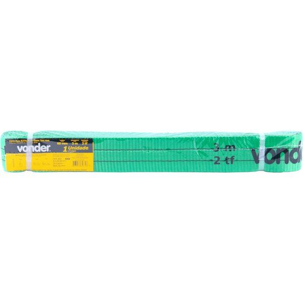 Ref. Fornecedor: 8014302060Marca: VonderConteúdo Embalagem:1 Cinta para elevação de cargasAplicações e dicas de uso:Indicada para elevação e movimentação de cargas. Nunca utilizar para transporte e elevação de pessoas ou animais.Destaques e diferenciais:Possui excelente resistência, flexibilidade e facilidade no manuseio, reduzindo o esforço durante a operação, além de oferecer menor risco ou danos na movimentação de cargas. Cinta plana de elevação de carga tipo anel.Características Técnicas:Carga de trabalho da cinta em elevação vertical/direta: 2,0 tf Comprimento total da cinta elevação de carga: 3,0 m Fator de segurança da cinta de elevação de carga: 7:1 Largura da cinta: 60,0 mm Material da cinta: 100% Poliéster Norma de referência da cinta : ABNT NBR 15637-1