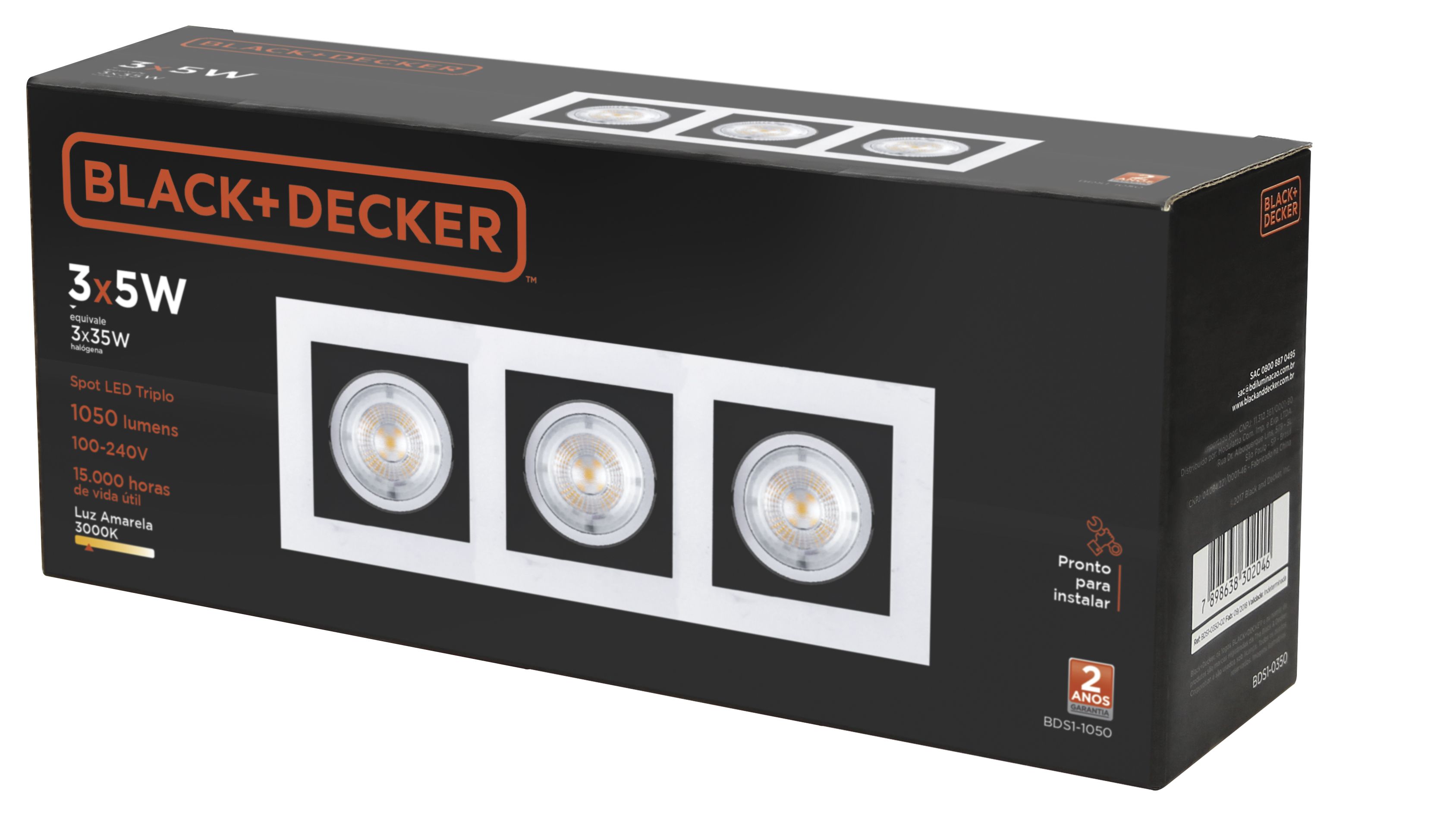 Ref. Fornecedor: BDS1-1050-01Marca: Black+DeckerConteúdo do anúncio: 01 unidade Os Spots LED BLACK+DECKER™ são ideais para transformar seu ambiente. Produzido com alto padrão de acabamento e qualidade de seus materiais, seu corpo e lâmpada acoplados facilitam a instalação e já vem pronto para embutir. Seu núcleo possibilita direcionamento da luz, proporcionando aconchego, sutileza e modernidade na decoração. Nas versões de 3W, 7W e 10W, quadrado ou redondo e nas opções de Luz Branca de 6500K e Luz Amarela de 3000K, podem ser facilmente instalado em forros de madeira, gesso ou drywall e em ambientes como: quartos, hall de entrada, salas, living e muito mais. Linha: SPOTFormato de Lâmpada: SPOT TRIPLOAcabamento do Vidro ou Plástico da Lâmpada: TRANSPARENTEMaterial da Lampada: PLASTICO ABSTipo de Soquete: CABOVoltagem: 100-240VWatts (W): 3x5Lumens (lm): 1050Frequência: 50/60HzSubstitui uma Lâmpada Incandescente de: 3x5Substitui uma Lâmpada Fluorescente de: N/AÂngulo de Facho: 50Temperatura Cor: 3000KCor da Luz: AmarelaIRC (Índice de Reprodução de Cor): =70Durabilidade da Lâmpada: 15000Garantia (em meses): 24Índice de Proteção: IP20Dimerizavél: NÃOTipo de Led: SMDPossui Reator Integrado: NÃO