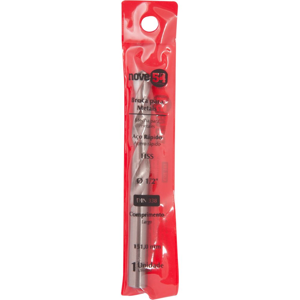 Marca: Nove54Conteúdo da Embalagem:1 Broca de aço rápido, encartelada, DIN 338Destaques e diferenciais:Produzida em aço rápido, proporcionando maior durabilidadeAplicações e dicas de uso:Indicada para uso em metais ferrosos e não ferrosos. Para aumentar a vida útil da broca, recomenda-se utilizar fluído/óleo de corte para lubrificação e resfriamento. Uso leve.Características Técnicas:Diâmetro da broca (pol): 0.1/2 " Comprimento total da broca : 151,0 mm Norma.: DIN 338