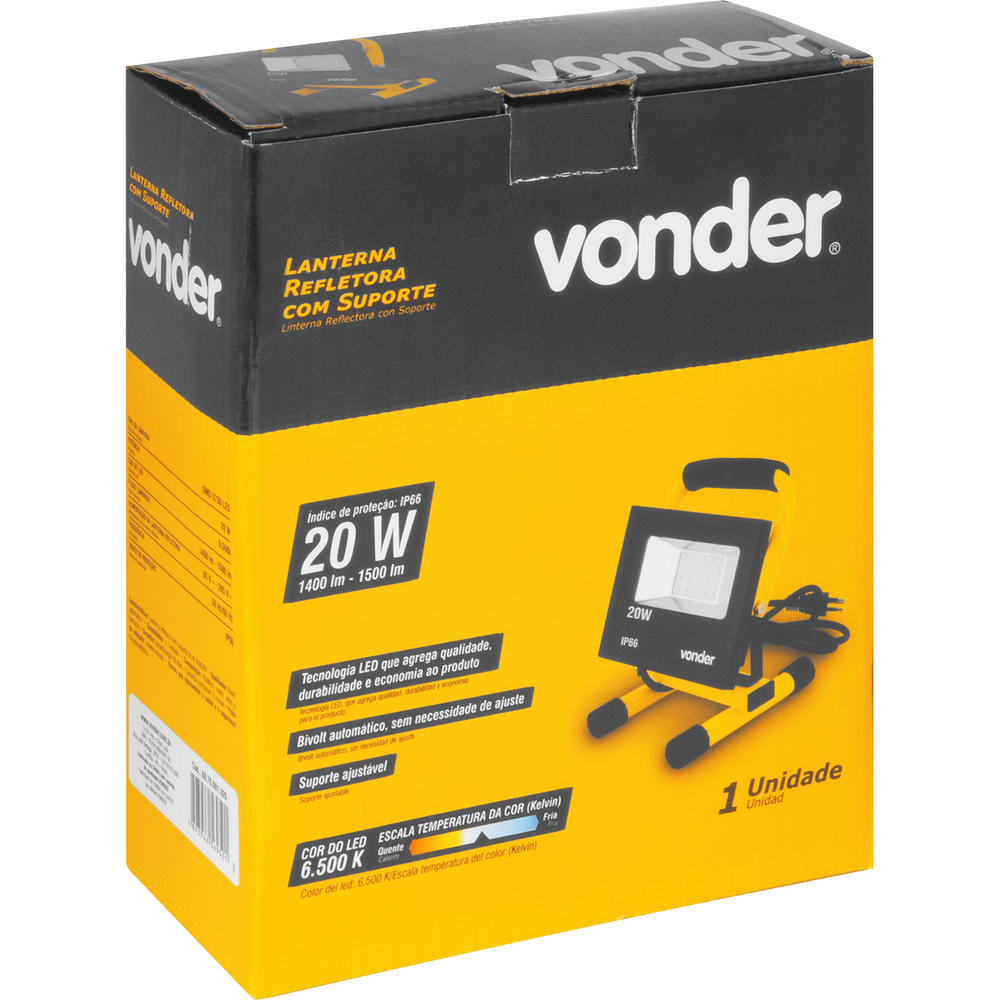Marca: VonderConteúdo da Embalagem:1 Suporte e 1 refletor de 20 WDestaques e diferenciais:Refletor com tecnologia LED que agrega qualidade, durabilidade e economia ao produto. Possui bivolt automático, podendo ser colocado tanto na tensão 127 V~ quanto 220 V~, sem a necessidade de qualquer ajuste. Possui suporte ajustável.Aplicações e dicas de uso:Indicada para iluminação em geral. Utilizada em camping, residências, entre outros, em situações para iluminação dirigida e de destaque, valorizando objetos.Características Técnicas:Material da carcaça: Metálico Tipo de lâmpada: Led SMD 5730 Comprimento do cordão elétrico: 1,60 m Índice de proteção (IP): IP66 Alimentação da lanterna refletora: 85 V~ - 265 V~ - bivolt automático