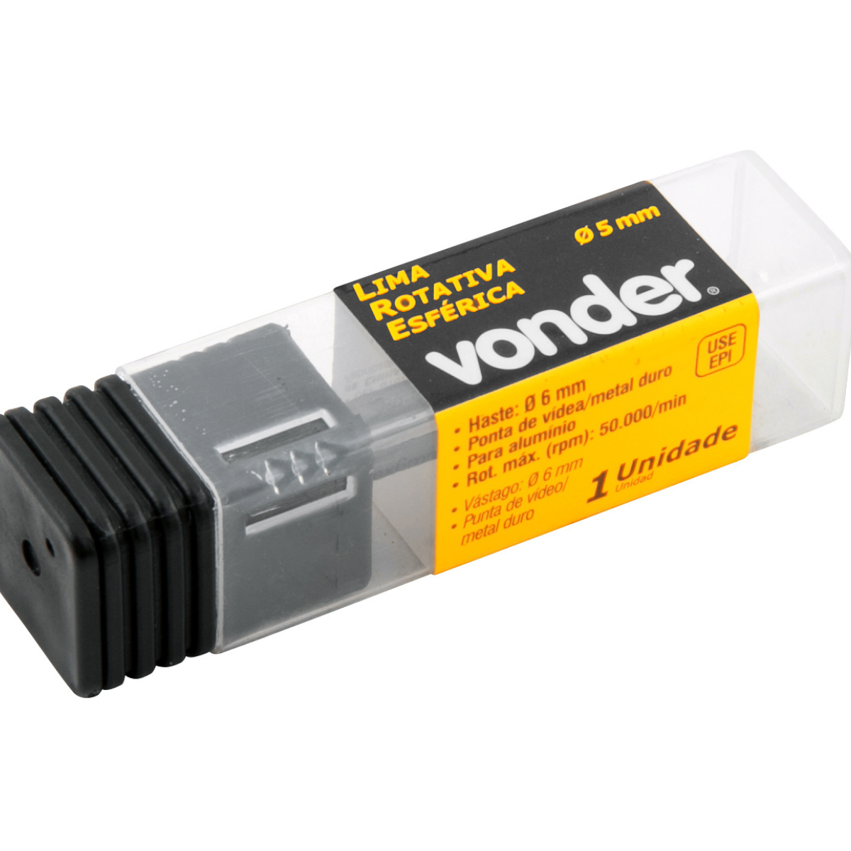 Marca: VonderConteúdo da Embalagem:1 Lima rotativaDestaques e diferenciais:Ponta de vídea/metal duro, proporciona maior vida útil, com geometria e ranhura apropriada para desbastes em peças de alumínio, com alto poder de remoção proporcionando agilidade e melhor acabamento no produto.Aplicações e dicas de uso:Utilizada em retificadeira para desbaste e acabamento em alumínioCaracterísticas Técnicas:Forma da lima rotativa: Esférica Diâmetro da lima rotativa: 5,0 mm Comprimento total da lima rotativa: 45,0 mm Diâmetro da haste da lima rotativa: 6,0 mm