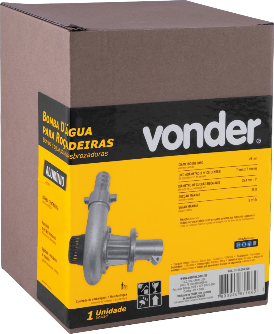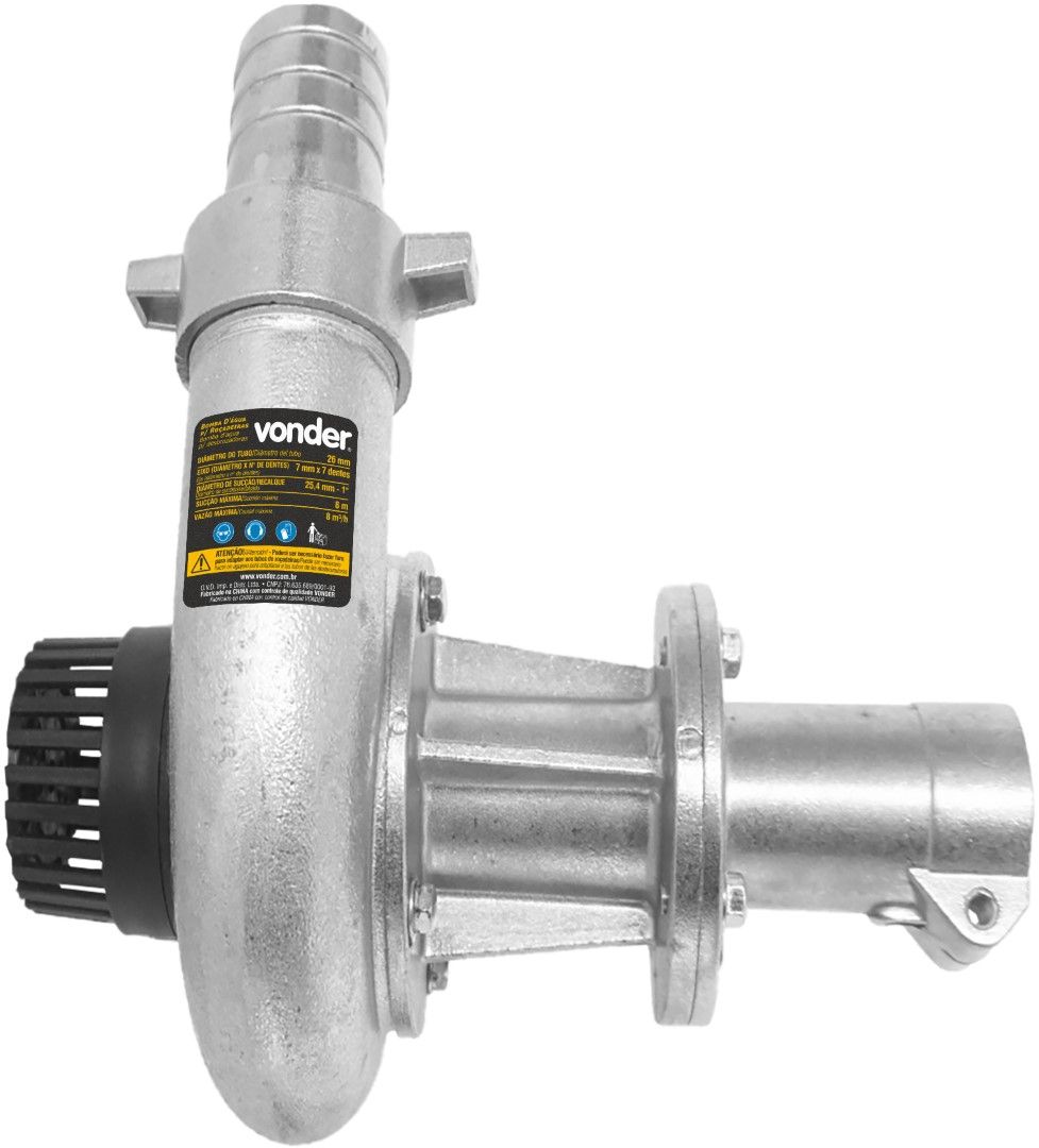 Bomba D'água Para Roçadeiras VonderA Bomba D'água Vonder é a solução ideal para quem busca aumentar a eficiência e durabilidade das roçadeiras. Desenvolvida pela renomada marca Vonder, conhecida por sua qualidade e inovação, esta bomba é perfeita para quem deseja otimizar o tempo e esforço no trabalho de jardinagem e manutenção de áreas verdes. Com um design funcional e de fácil manuseio, ela se acopla facilmente no tubo da roçadeira, proporcionando agilidade e eficiência incomparáveis. A bomba é compatível com roçadeiras que possuem tubo com diâmetro de 26 mm e eixo cardan de 7 mm x 7 dentes, incluindo modelos Vonder como RGO 2540C, RGP 2540C e RGP 3260C. Além disso, pode ser utilizada em roçadeiras multimarcas, desde que atendam às características de encaixe e potência mínima de 25 cc. Isso garante versatilidade e ampla aplicação, tornando-a um acessório indispensável para profissionais e entusiastas da jardinagem.ESPECIFICAÇÕES TÉCNICAS:- Marca: Vonder- Código universal de produto: 7893946671662- Modelo: 3187004000- Diâmetro do tubo: 26 mm- Eixo cardan: 7 mm x 7 dentesFUNÇÕES E CARACTERÍSTICAS:- Aumenta a eficiência e durabilidade das roçadeiras- Fácil instalação e manuseioINSTRUÇÕES DE USO:1. Verifique se a roçadeira possui as especificações de diâmetro e eixo compatíveis.2. Acople a bomba no tubo da roçadeira conforme as instruções do manual.ITENS INCLUSOS:- 1 Bomba d'água