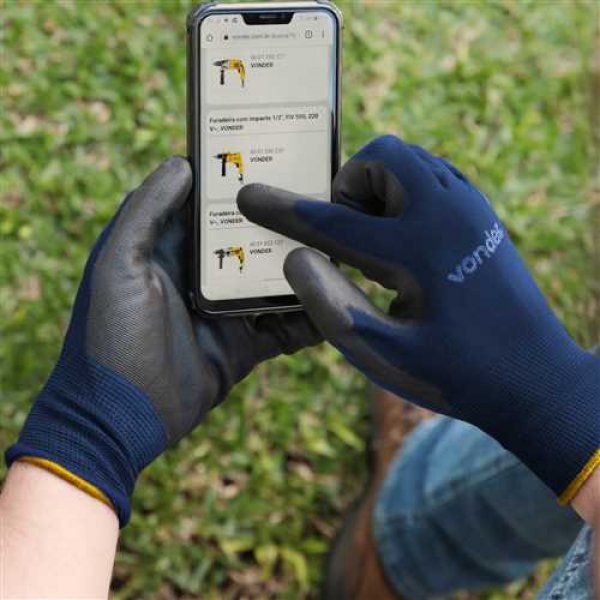 Marca: VonderConteúdo da embalagem: 1 Par de luvas.Destaques e diferenciais:Luva de segurança confeccionada em fibras sintéticas. Possui revestimento da face palmar e ponta dos dedos em poliuretano (PU) com a função touch screen (sensibilidade tátil). Conta com punho com inserções de fibras elásticas e acabamento em overloque.Dicas de uso:Indicada para proteção das mãos do usuário contra agentes escoriantes. Restrição: EPI não aprovado para uso em operações de soldagem e processos similares.Detalhes Técnicos:Certificado de aprovação (CA): 45387 Tamanho da luva: 8 (M/G) Revestimento: Fibras sintéticas Cor: Azul e preta