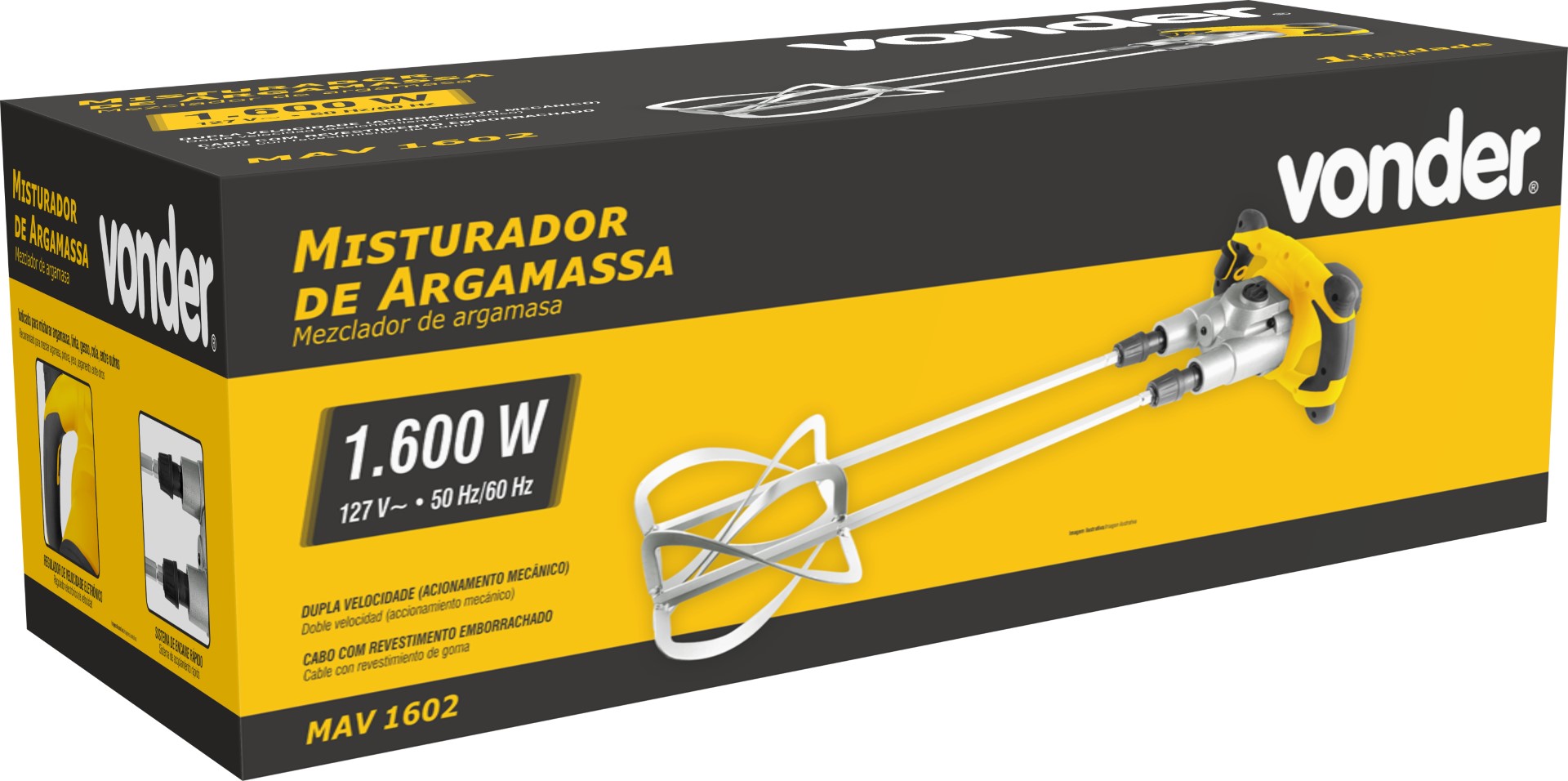 Marca: VonderConteúdo da embalagem: 1 Misturador. Acompanha: 2 pás para misturadorDestaques e diferenciais:Com 2 pás, proporcionando mais rapidez e uma mistura mais homogênea. Possui dupla velocidade (acionamento mecânico), sistema de encaixe rápido para pás, regulador de velocidade eletrônico e cabo com revestimento emborrachado, que proporciona maior conforto ao operador.Dicas de uso:Indicado para misturar argamassa, tinta, gesso, cola, entre outros.Detalhes Técnicos:Tensão (V~): 127 V~ Potência: 1.600 W Rotações por minuto (rpm): Posição 1: 200 /min - 480 /min; Posição 2: 250 /min - 680/min Rosca da pá: Sistema encaixe rápido Comprimento total da pá (pá + extensão): 550 mm Diâmetro da haste da pá: Sextavado 13 mm Diâmetro da pá: 120 mm