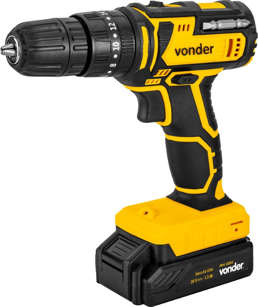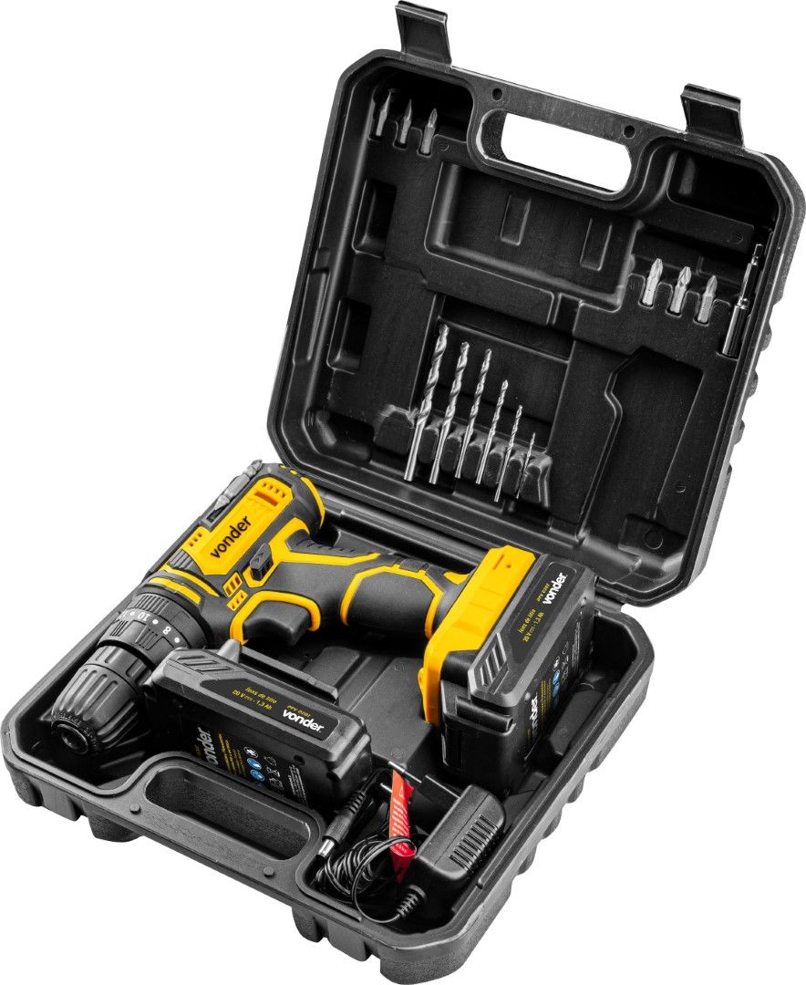 Marca: VonderConteúdo da embalagem: 1 Parafusadeira/furadeira. Acompanha: 1 maleta, 2 baterias de 20 V, 1 carregador bivolt automático, 6 brocas para madeira (1,5 mm, 2,5 mm, 3,0 mm, 4,0 mm, 5,0 mm e 6,0 mm), 6 bits (2 fendas (5 mm e 6 mm), 2 phillips (PH1 e PH2) e 2 pozidrive (PZ1 e PZ2)) e 1 soquete magnético encaixe de 1/4" + 1 bits de ponta dupla (ponta PH2 e ponta fenda 5,5 mm).Destaques e diferenciais:Possui 1 posição com 18 regulagens de torque para parafusamento e 2 posições para perfuração (com e sem impacto). Conta ainda com LED para melhor visibilidade do local de trabalho, indicador de nível de carga da bateria, cabo com revestimento emborrachado, proporcionando maior conforto ao operador, e bateria de íons de lítio que confere alta eficiência de operação, além de carregador bivolt automático com tensão de entrada de 100 V~ - 240 V~.Dicas de uso:Indicada para soltar e apertar parafusos de até 8 mm de diâmetro e fazer furos em madeiras ou metais na função sem impacto e em concreto na função com impacto. Tempo de carregamento da bateria: 3 a 5 horas.Detalhes Técnicos:Bateria: 20 V - 1,3 Ah - Íons de lítio Tensão do carregador de bateria: 100 V~ - 240 V~ - Bivolt automático Tipo de mandril: Aperto rápido Capacidade do mandril: 3/8" - 10,0 mm Sistema de reversão: Sim Tipo de velocidade: Variável (2 velocidades) Rotações por minuto (rpm): 0 - 400/min / 0 - 1.400/min Impactos por minuto (ipm): 0 - 21.000/min Capacidade máxima de perfuração em aço: 10,0 mm Capacidade máxima de perfuração em madeira: 20,0 mm Capacidade de furação no concreto/alvenaria: 10,0 mm