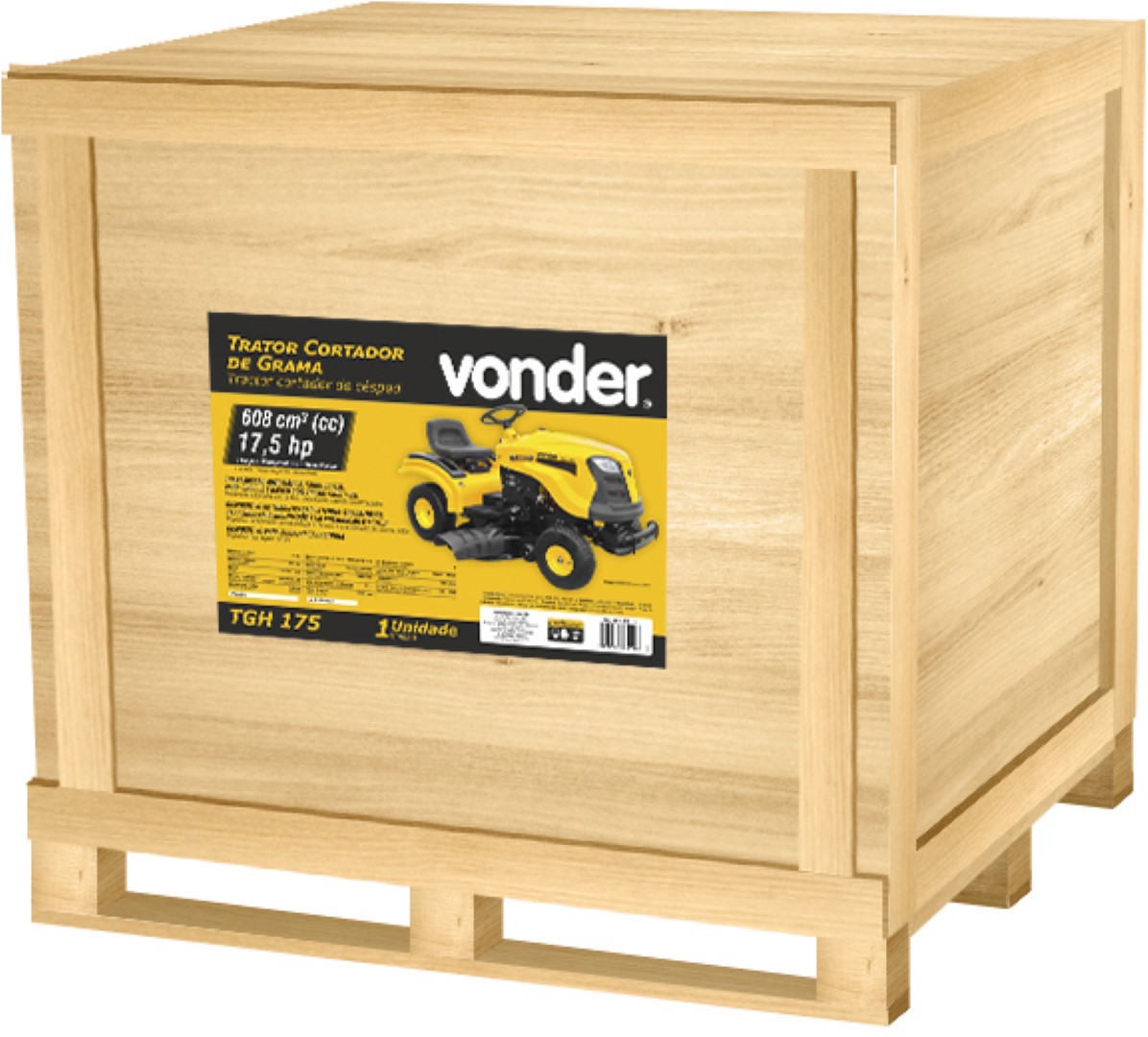 Marca: Vonder Conteúdo da embalagem: 1 Trator. Destaques e diferenciais:Possui transmissão automática, farol de LED, para-choque, banco com trilho ajustável, partida elétrica, 6 ajustes de altura de corte e bomba de óleo. Conta ainda com dispositivo de lubrificação interna, que permite ao trator trabalhar em terrenos mais inclinados (até 15° graus para cima e para baixo) sem prejudicar o motor. Dispõe ainda de horímetro, que facilita o controle das manutenções, engate para carreta e dispositivo de segurança no banco que, em caso de queda do operador, desliga o trator automaticamente. Dicas de uso:Indicado para áreas extensas, tais como, sítios, chácaras, fazendas, campos de futebol, clubes, condomínios, entre outros. Bateria indicada: 12 V - 24 Ah (NÃO ACOMPANHA). Código da bateria: 80 55 030 012 (vendida separadamente). Dimensões máximas da bateria indicada: comprimento: 197 mm, largura: 130 mm, altura: 158 mm. Equipamento deve ser utilizado somente com acessórios compatíveis. Ao adquirir este produto, favor agendar entrega técnica via nossa Assistência ao Consumidor (ASCON), através do telefone 0800 723 47 62. Detalhes Técnicos:Modelo:TGH 175Partida:EletricaMotor:VONDERTipo de motor a combustão:4 tempos - Refrigerado a ar - MonocilindroCilindrada:608 cm³Potência do motor:17,5 cv/hpCombustível:Gasolina comumCapacidade do tanque de combustível:5,5 LConsumo aproximado do motor.:2,0 litros/horaCapacidade do reservatório (tanque de óleo):1,6 LTipo do óleo do motor:15W-30 ou 15W-40.Tipo do óleo da caixa de transmissão:10W-30Relação de mistura:Use gasolina nova, limpa, não aditivada e com um mínimo de 87 octanas.Número de marchas:Automática (frente e ré)Inclinação máxima permitida:Máximo 5° de inclinação lateral / Máximo 15° para inclinação para cima e para baixo.Bateria indicada:12 V - 24 Ah **Não acompanha.Número de ajustes de altura:6 ajustes de altura.Altura mínima de corte:Aproximadamente 20,0 mmAltura máxima de corte:Aproximadamente 80,0 mmAltura máxima da grama para corte:Aproximadamente 150,0 mmCapacidade de corte (largura máxima):1.066 mmVelocidade máxima:Frente: 10,2 km/h Ré: 3,40 km/hRaio de giro:2,0 mSistema de tração:TraseiroSistema de transmissão:AutomáticaTaxa de compressão do motor:8,7:1Diâmetro das rodas:Dianteira: 15" × 6"- 6" / Traseira: 18" × 8.5" - 8"Pneu:4Recolhedor:Sem recolhedorNível de pressão sonora (LpA):100 dB (A)Aceleração transmitida nas mãos - braços do operador - ah:5,8 m/s²Incerteza da aceleração transmitida nas mãos - braços do operador - k:1,5 m/s²Massa aproximada (peso):311 kg