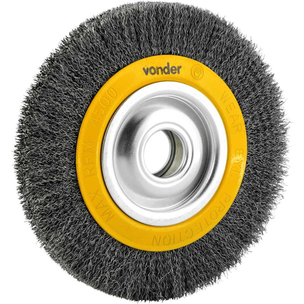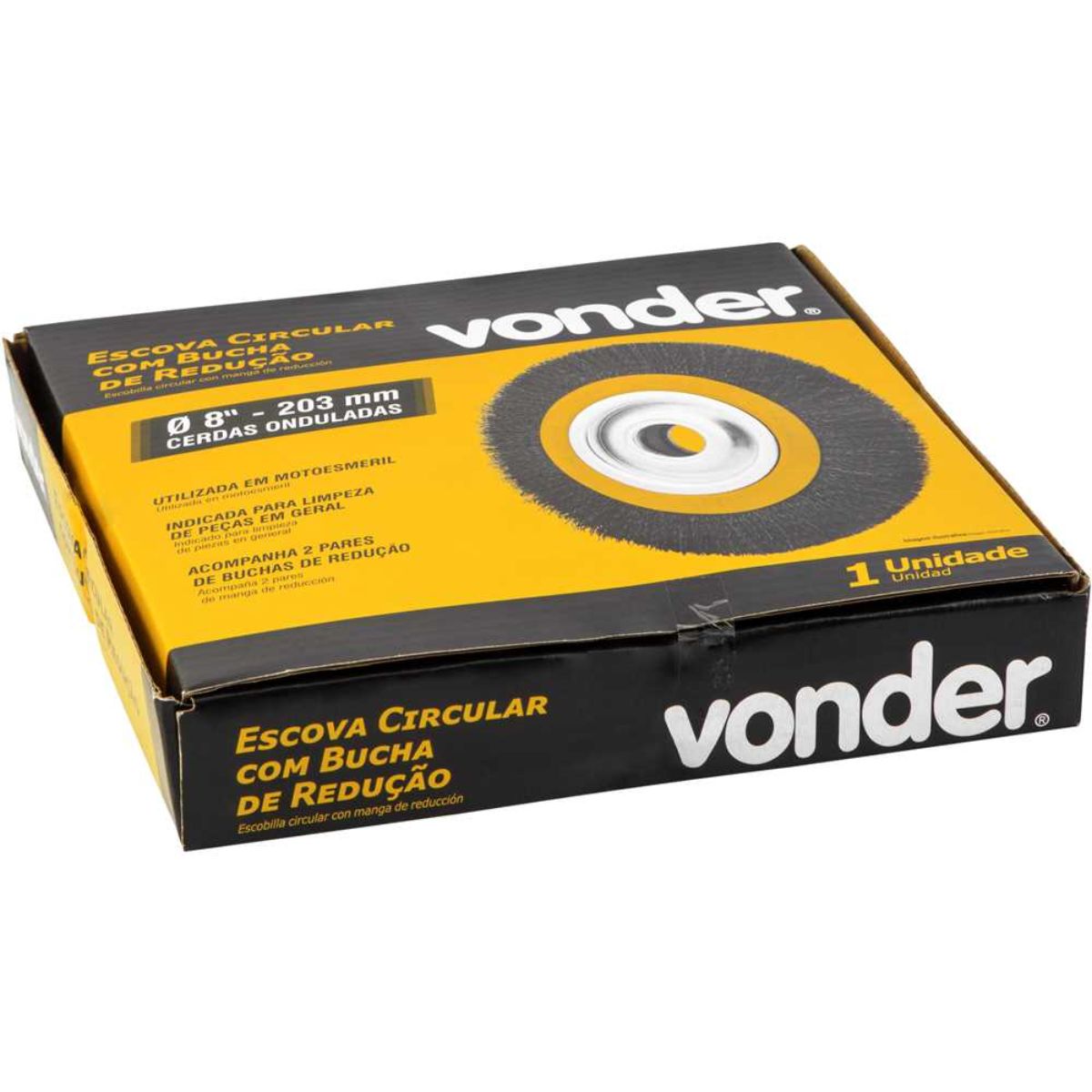 Escova Aço Vonder Circular 8" x 1.3/16" com ReduçãoA Escova de Aço Circular Vonder 8" x 1.3/16" com Redução é uma ferramenta indispensável para quem realiza limpezas pesadas em peças metálicas, proporcionando desempenho confiável e versatilidade no uso com motoesmeril. Ideal para oficinas, indústrias, serralherias e demais aplicações profissionais, ela é indicada para a remoção de ferrugem, tinta, rebarbas leves, sujeiras impregnadas e oxidação em superfícies de metal, garantindo maior produtividade e acabamento mais limpo.Fabricada com cerdas em aço carbono polido e estrutura robusta, esta escova oferece excelente resistência ao desgaste e longa vida útil, mesmo em aplicações mais exigentes. Suas cerdas onduladas permitem uma limpeza eficiente sem agredir excessivamente a superfície da peça, o que é essencial em tarefas de manutenção ou preparo de superfícies para pintura e solda.Com diâmetro externo de 8" (203 mm) e espessura de 1.3/16" (30 mm), ela oferece uma ótima área de contato com a peça, otimizando o tempo de trabalho. O furo central tem 1.1/4" (31,5 mm), e o produto acompanha um kit completo de buchas de redução — para eixos de 1", 7/8", 3/4", 5/8" e 1/2" — garantindo compatibilidade com diferentes tipos de motoesmeris e facilitando a instalação. Projetada para trabalhar em rotações de até 4.500 RPM, a escova assegura desempenho estável e seguro durante o uso, desde que respeitadas as especificações da ferramenta elétrica utilizada.Especificações- Material/acabamento das cerdas da escova: Aço carbono/polido- Tipo de cerdas da escova: Ondulada- Diâmetro: 8" - 203 mm- Espessura: 1.3/16" - 30 mm- Diâmetro do furo: 1.1/4" - 31,5 mm- Rotações por minuto (rpm): 4.500/min- Massa aproximada (peso): 0,821 kgItens inclusos- 01 Escova Aço Vonder 8" x 1.3/16"- 1 par de buchas de redução para 1/2"- 1 par de buchas de redução para 5/8"- 1 par de buchas de redução para 3/4"- 1 par de buchas de redução para 7/8"- 1 par de buchas de redução para 1Garantia- 03 meses com o Fabricante