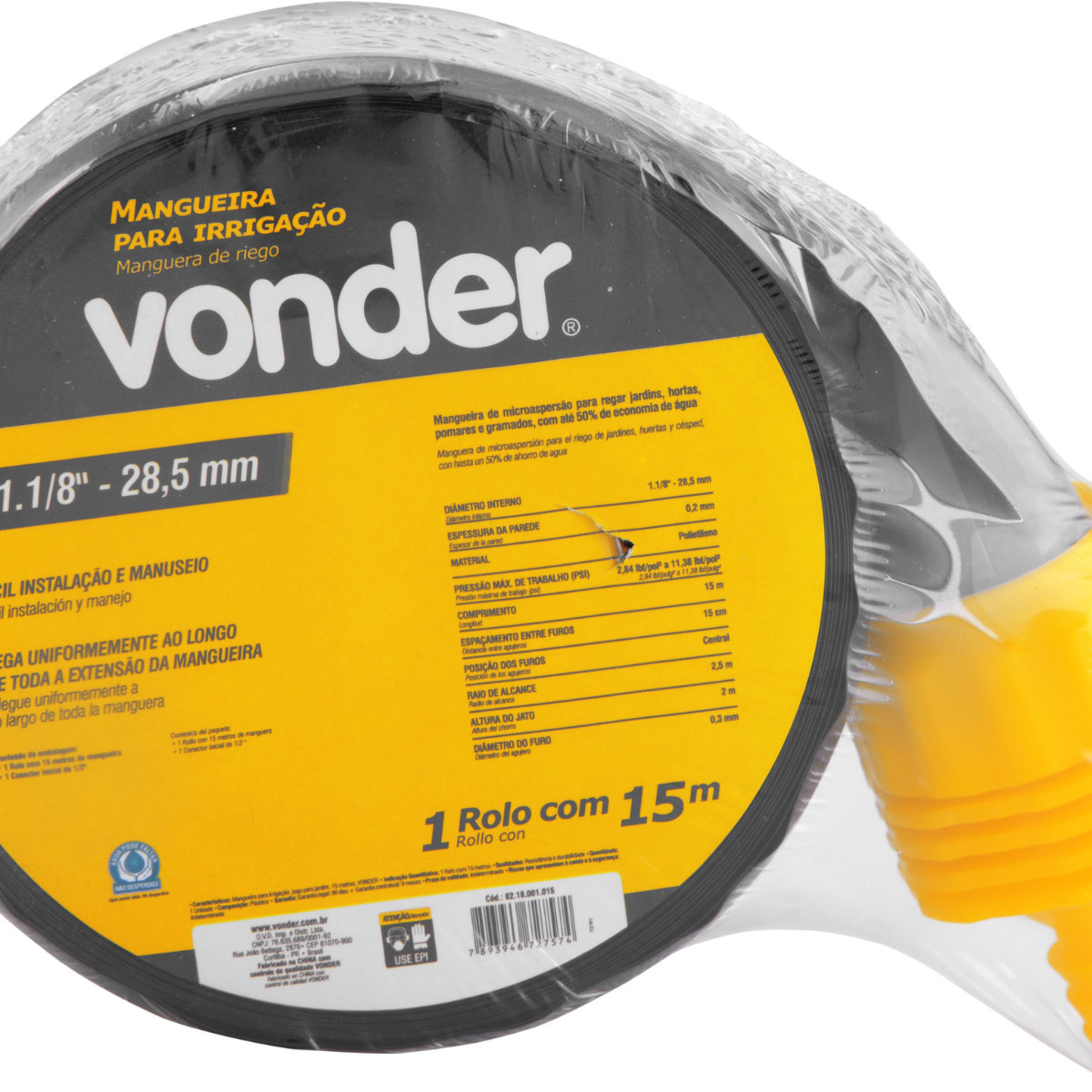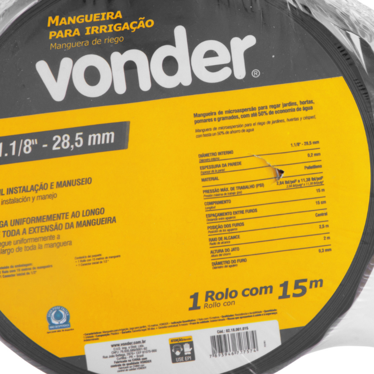 Kit Jardim Para Irrigação 15 Metros VonderTransforme o cuidado com o seu jardim em uma tarefa simples e eficiente com o Kit Jardim Para Irrigação 15 Metros Vonder. Este sistema de irrigação é ideal para quem busca praticidade e economia de água, sendo perfeito para jardins, hortas, pomares e gramados. Com a tecnologia de microaspersão, você garante uma rega uniforme ao longo de toda a extensão da mangueira, proporcionando o cuidado necessário para suas plantas crescerem saudáveis e viçosas. Além disso, a instalação é fácil e o manuseio é intuitivo, mesmo para quem não tem experiência com sistemas de irrigação.A Vonder é uma marca reconhecida pela qualidade e durabilidade de seus produtos, e este kit não é exceção. Com ele, você pode economizar até 50% de água, contribuindo para a sustentabilidade e redução de custos. A mangueira é feita de polietileno, um material resistente e durável, garantindo que o produto tenha uma longa vida útil. ESPECIFICAÇÕES TÉCNICAS:- Marca: Vonder- Modelo: 8218001015- Comprimento da mangueira: 15,00 m- Diâmetro interno: 1" (25,4 mm)- Espessura da parede: 0,2 mm- Cor da mangueira: Preto- Material da mangueira: Polietileno- Posição dos furos: Central- Espaçamento entre furos: 15,0 cm- Altura do jato: 2,00 m- Raio de alcance: 2,50 m- Pressão máxima de trabalho: 2,84 lbf/pol² a 11,38 lbf/pol²- Massa aproximada (peso): 0,359 kg- Código universal de produto: 7893946727574FUNÇÕES E CARACTERÍSTICAS:- Fácil instalação e manuseio- Rega uniforme ao longo de toda a extensão- Economia de até 50% de água- Ideal para jardins, hortas, pomares e gramadosINSTRUÇÕES DE USO:1. Desenrole a mangueira no local desejado.2. Conecte o conector inicial de 1/2" à fonte de água.3. Ajuste a posição dos furos para garantir a cobertura desejada.4. Ligue a água e ajuste a pressão conforme necessário.ITENS INCLUSOS:- 1 Rolo com 15 metros de mangueira- 1 Conector inicial de 1/2"