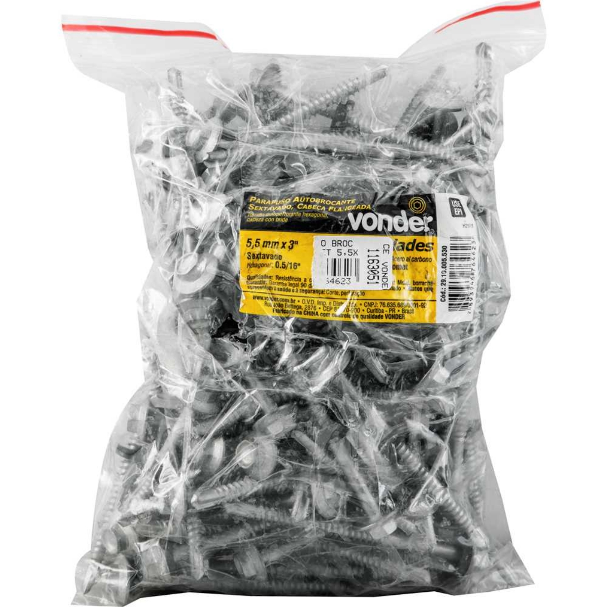 Marca: VonderConteúdo da embalagem:100 unidades.Destaques e diferenciais:Possui cabeça flangeada ou seja, de maior diâmetro com maior plano de ação, evitando vazamentos, esmagamento, garantindo maior eficiência na aplicação. Além de acabamento tipo Dacromet, proporcionando maior resistência contra oxidação/corrosão. Conta com arruela de neoprene.Aplicações e dicas de uso:Indicado para fixação de coberturas e telhados metálicos. Utilizado também para fixação de chapas finas e união dos encontros das telhas em coberturas metálicas.Detalhes TécnicosMaterial (tipo/composição): Aço carbonoAcabamento: Tipo Dacromet Diâmetro: 5,5 mmComprimento: 3"Cabeça: SextavadaMedida do sextavado: 5/16"Massa aproximada (peso) (kg): 1,03 kgGarantia - E (CDC):Garantia legal: 90 dias