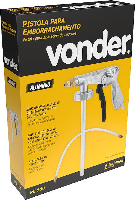 Marca: VonderConteúdo da embalagem:1 Pistola para emborrachamento.Destaques e diferenciais:Possui corpo em alumínio, proporcionando maior durabilidade e resistência. Conta ainda com regulagem de saída de ar e formato ergonômico, fornecendo maior conforto na operação.Aplicações e dicas de uso:Indicada para aplicação de emborrachamento em funilarias. Também pode ser utilizada na aplicação de líquidos com maior viscosidade.Detalhes TécnicosConsumo de ar da pistola: 4 pcm (pé³/min) Pressão de trabalho: 90 lbf/pol² Material do corpo da pistola: Alumínio Rosca de entrada de ar: Engate rápido de 1/4" Tipo de bico: Flexível Comprimento da haste (pescador): 220 mm Massa aproximada (peso) (kg): 0,35 kg Garantia - E (CDC):Garantia legal: 90 dias