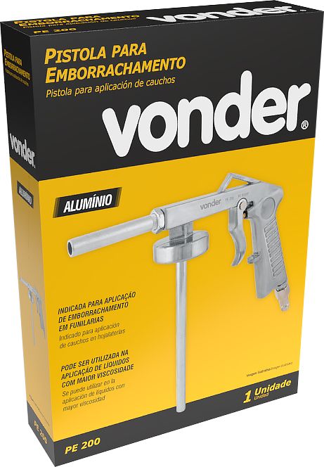 Marca: VonderConteúdo da embalagem:1 Pistola para emborrachamento.Destaques e diferenciais:Possui corpo em alumínio, proporcionando maior durabilidade e resistência. Além de formato ergonômico, fornecendo maior conforto na operação.Aplicações e dicas de uso:Indicada para aplicação de emborrachamento em funilarias. Também pode ser utilizada na aplicação de líquidos com maior viscosidade.Detalhes TécnicosConsumo de ar da pistola: 4 pcm (pé³/min) Pressão de trabalho: 90 lbf/pol² Material do corpo da pistola: Alumínio Rosca de entrada de ar: Engate rápido de 1/4" Tipo de bico: Rígido Comprimento da haste (pescador): 240 mm Massa aproximada (peso) (kg): 0,28 kg Garantia - E (CDC):Garantia legal: 90 dias