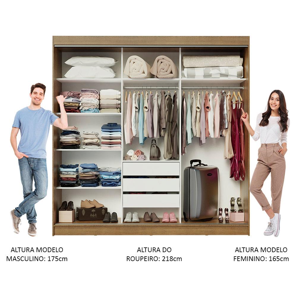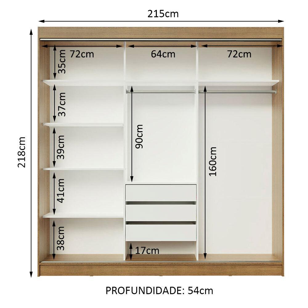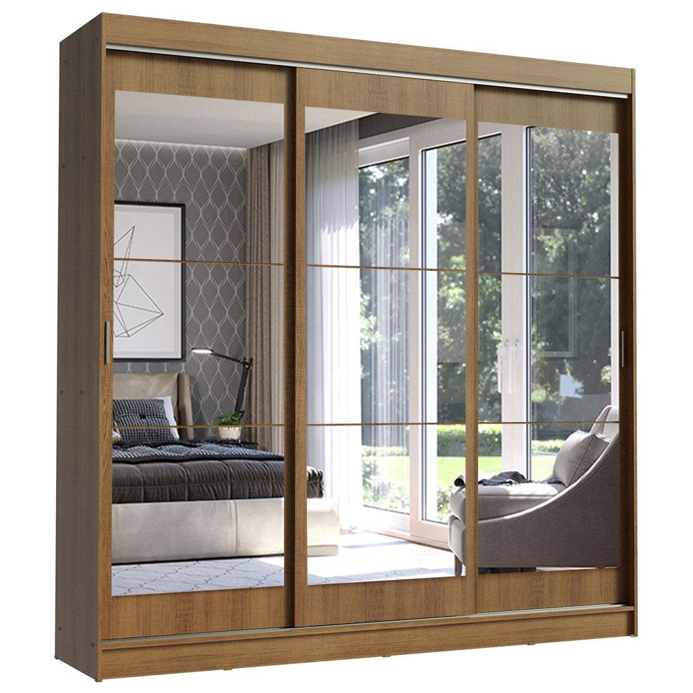 Com tamanho ideal para casal, o Guarda-Roupa Istambul da Madesa possui três portas de correr com deslizamento suave, trilhos em alumínio para maior resistência e dois puxadores externos.Um dos principais diferenciais desta versão é que todas as portas possuem espelhos, que ampliam o ambiente e são bastante práticos no dia a dia. Internamente, o espaço é ótimo, com diversas prateleiras e nichos, além de três gavetas espaçosas com corrediças metálicas, muito mais seguras e resistentes.Para completar, os dois cabideiros são em alumínio e possuem espaços tanto para roupas curtas quanto mais longas. Ou seja, tem lugar pra organizar tudo: roupas, calçados, malas, travesseiros, edredons e muito mais.O acabamento externo é em amadeirado Rustic e a parte interna é branca. São feitos com a Pintura Poliéster exclusiva da Madesa. Esse processo é ecologicamente correto e conserva o móvel por muito mais tempo.Medidas totais do móvel: 218 cm de altura x 215 cm de largura x 54 cm de profundidade.As imagens são meramente ilustrativas.Itens inclusos:- Três (3) portas de correr com sistema anti-descarrilhamento, todas com espelhos- Dois (2) puxadores em alumínio com detalhes em PVC- Três (3) gavetas internas com corrediças metálicas- Dois (2) cabideiros em alumínioCódigo do produto: 11185Z3EObs.: A Madesa não disponibiliza serviço de montagem. A embalagem acompanha as ferragens necessárias e o manual com todos os passos para a instalação do produto.1 – O produto é novo ou usado?R.: Todos os produtos da Madesa são novos, enviados da nossa fábrica diretamente para as casas de nossos clientes.2 – O produto vem montado? Se não, vocês realizam a montagem?R.: A Madesa não disponibiliza serviço de montagem. Todos os produtos seguem com manual de instalação e as ferragens necessárias. Alguns produtos possuem vídeo explicando o passo a passo da montagem.3 – Vocês possuem loja física? Posso retirar meu produto em mãos?R.: Não possuímos loja física, apenas loja virtual. Confira as opções de envio ao colocar o seu CEP.4 – Qual é o valor do envio? Posso pagar separadamente?R.: O valor do envio é calculado com base no peso e volume do produto, e no CEP de destino. Você pode calcular o valor e prazo de entrega no simulador.5 – A Madesa entrega em todo Brasil? Como é feita a entrega?R.: Sim, entregamos no Brasil inteiro através de transportadoras parceiras.6 – O produto acompanha Nota Fiscal?R.: Sim, todos os produtos são entregues com suas respectivas notas fiscais.7 – Os produtos possuem garantia?R.: Sim. A Madesa oferece 3 meses de garantia para defeitos de fabricação.A Madesa se dedica à sustentabilidade com várias iniciativas: temos uma usina própria para gerar energia que abastece uma de nossas fábricas. Selecionamos nossos fornecedores, priorizando aqueles que possuem um compromisso com a sustentabilidade e proteção do meio ambiente. Todo o plástico utilizado no setor produtivo é proveniente de reciclagem e as suas sobras são encaminhadas ao fornecedor que os recicla. Também investimos no desenvolvimento contínuo de nossos colaboradores e em ações educacionais que beneficiem a comunidade.